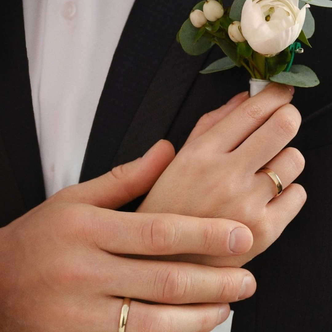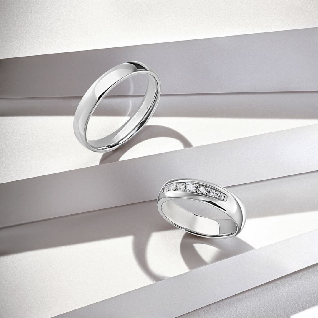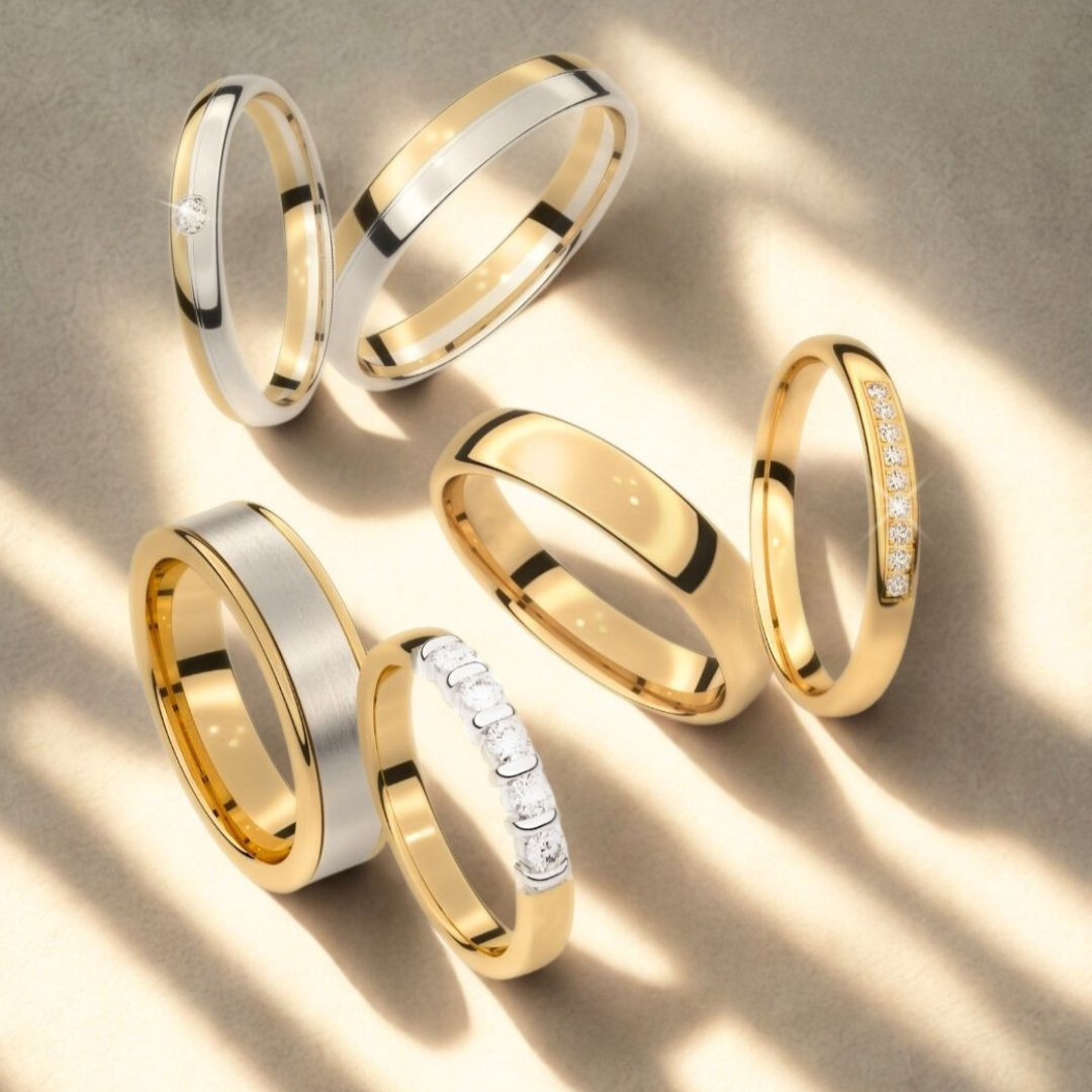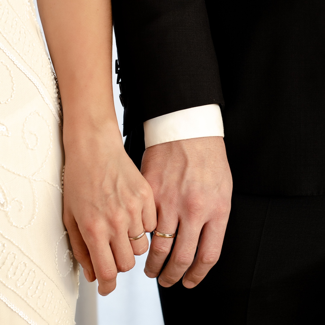 Verighetele noastre sunt realizate din metale prețioase de înaltă calitate: aur de 14k sau 18k (galben, alb, roz), platină sau paladiu. Fiecare metal are personalitatea lui, iar finisajele duc povestea mai departe: lucios oglindă, mat fin, satinat, periat, sablat sau combinații atent compuse. Marginile pot fi rotunjite pentru o senzație moale la mână sau bine definite pentru un stil arhitectural.