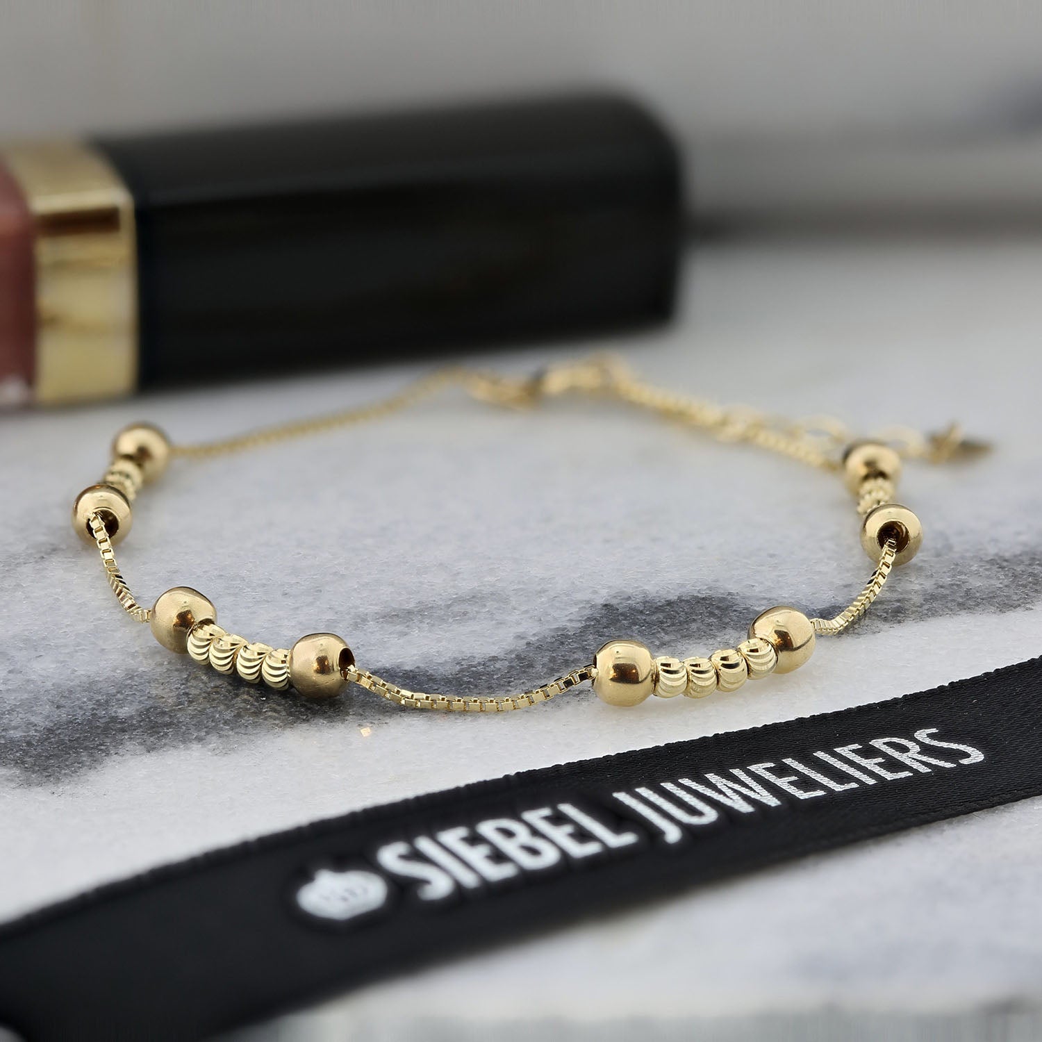 Bratara din aur galben cu margele taiate cu diamant din colectia Gold by Siebel. Fabricata din aur galben de 14 karate, bratara este decorata cu margele de diferite dimensiuni, fiecare cu un finisaj neted, taiat cu diamant. Bratara are 20 cm lungime.