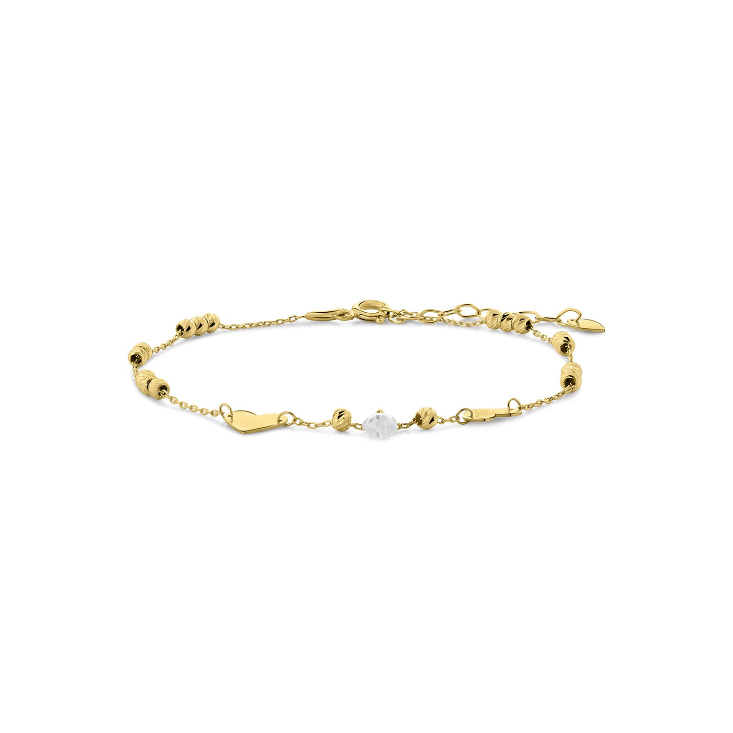 Bratara fantezie din aur galben din colectia Gold by Siebel. Fabricata din aur galben de 14 karate, bratara are o singura piatra de zirconiu. Este decorat cu diverse margele fatetate si inimioare cu un finisaj lustruit. Bratara are 20 cm lungime. Combina-l cu alte bijuterii din colectie pentru a-ti completa look-ul.
