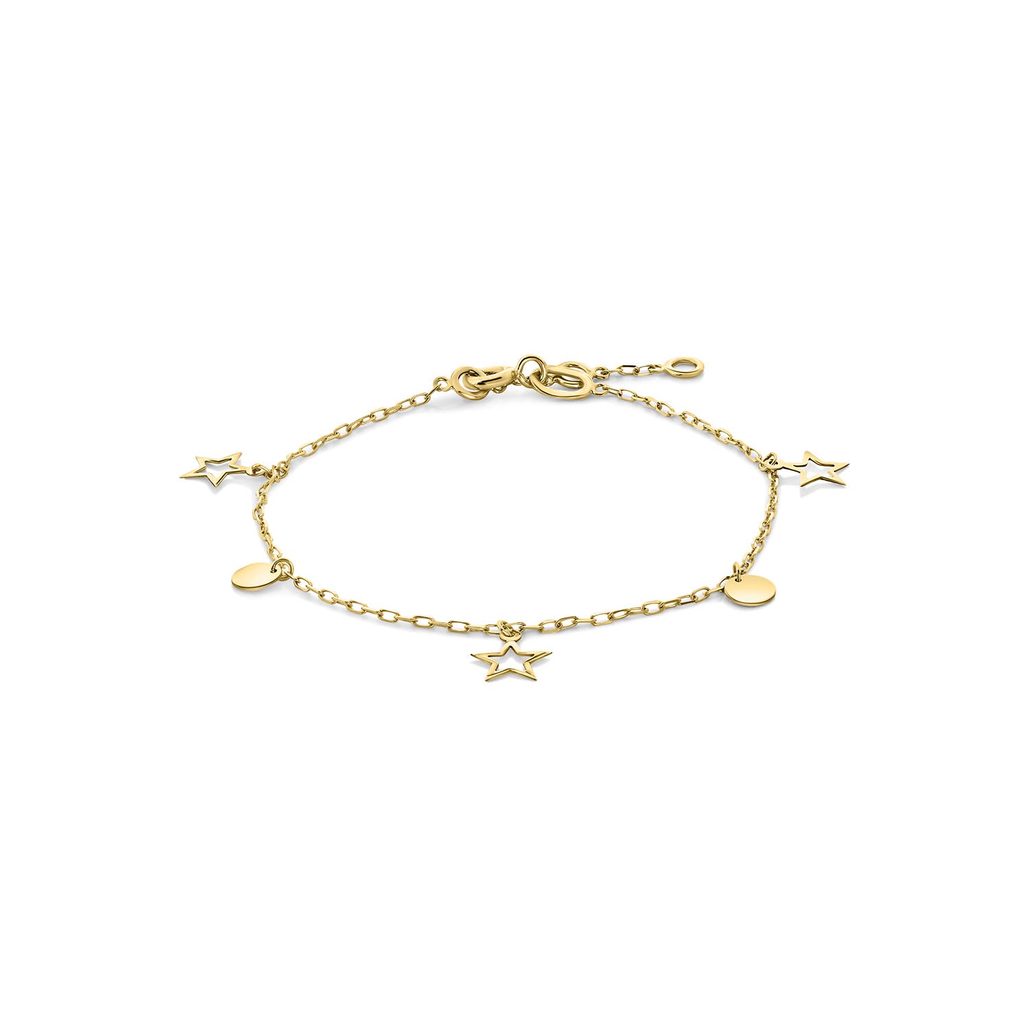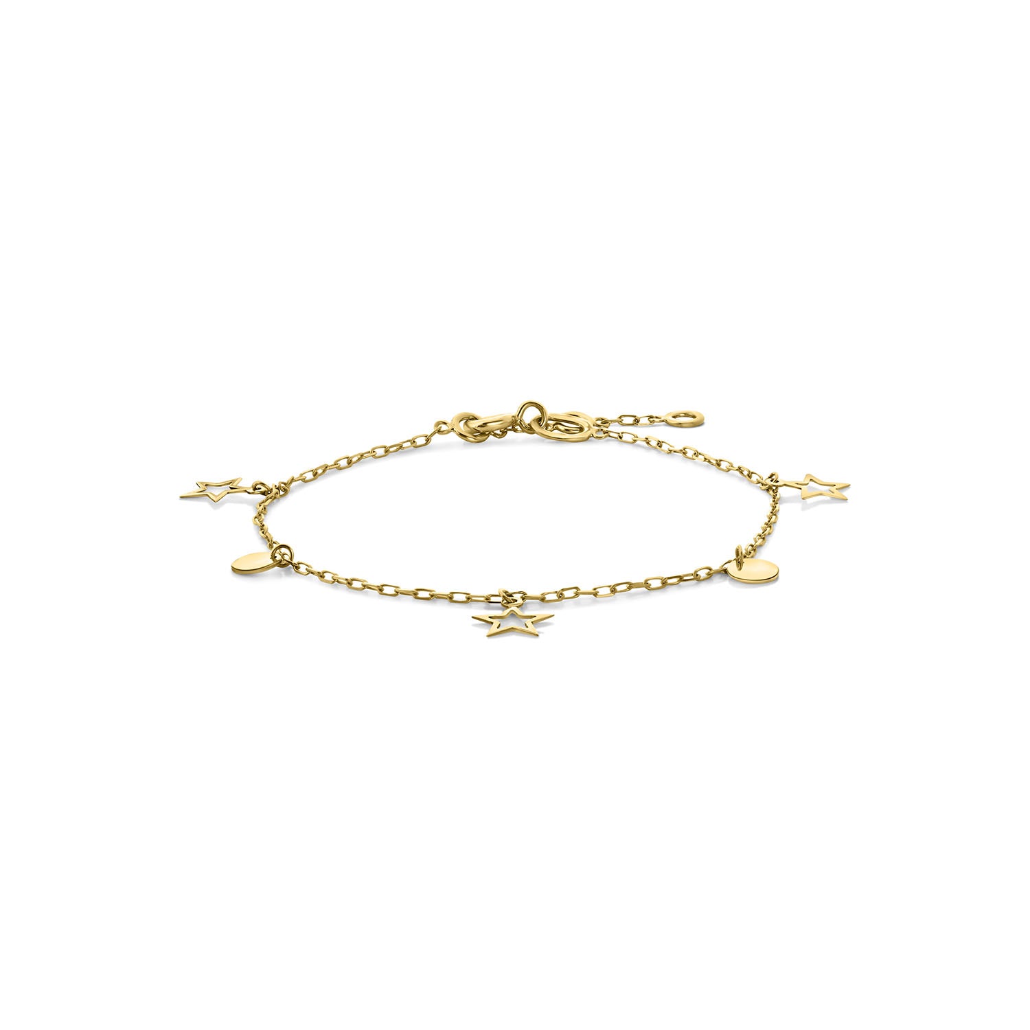 Bratara cu farmec din aur galben din colectia Gold by Siebel. Fabricata din aur galben de 14 karate, aceasta bratara este decorata cu brelocuri in forma de stea si disc. Bratara are 17 cm lungime.