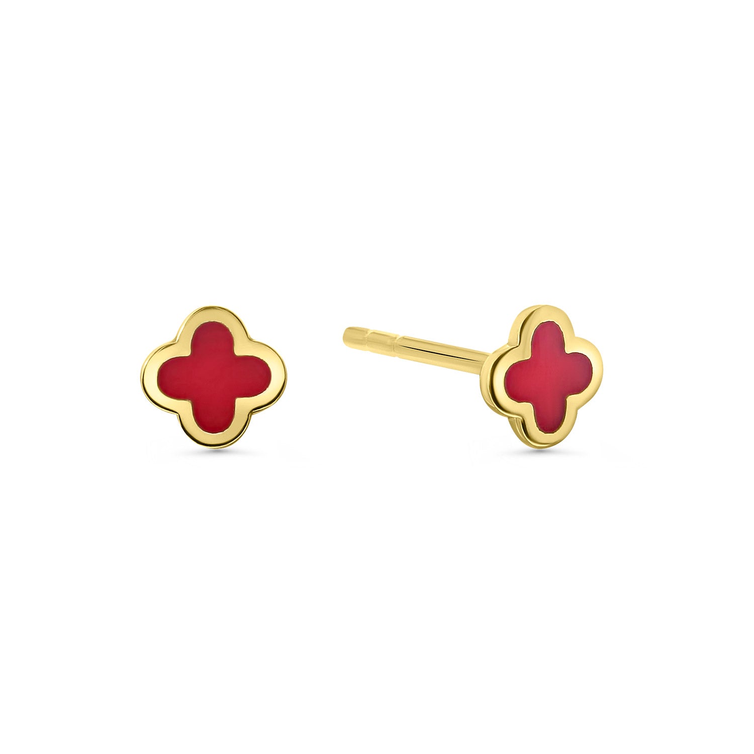 Cercei stud din aur galben din colectia Gold by Siebel. Acesti cercei tip stift sunt confectionati din aur galben de 14 karate si au email rosu. Au forma unui trifoi cu patru foi. Acesti cercei tip stift sunt cadoul perfect pentru copii.