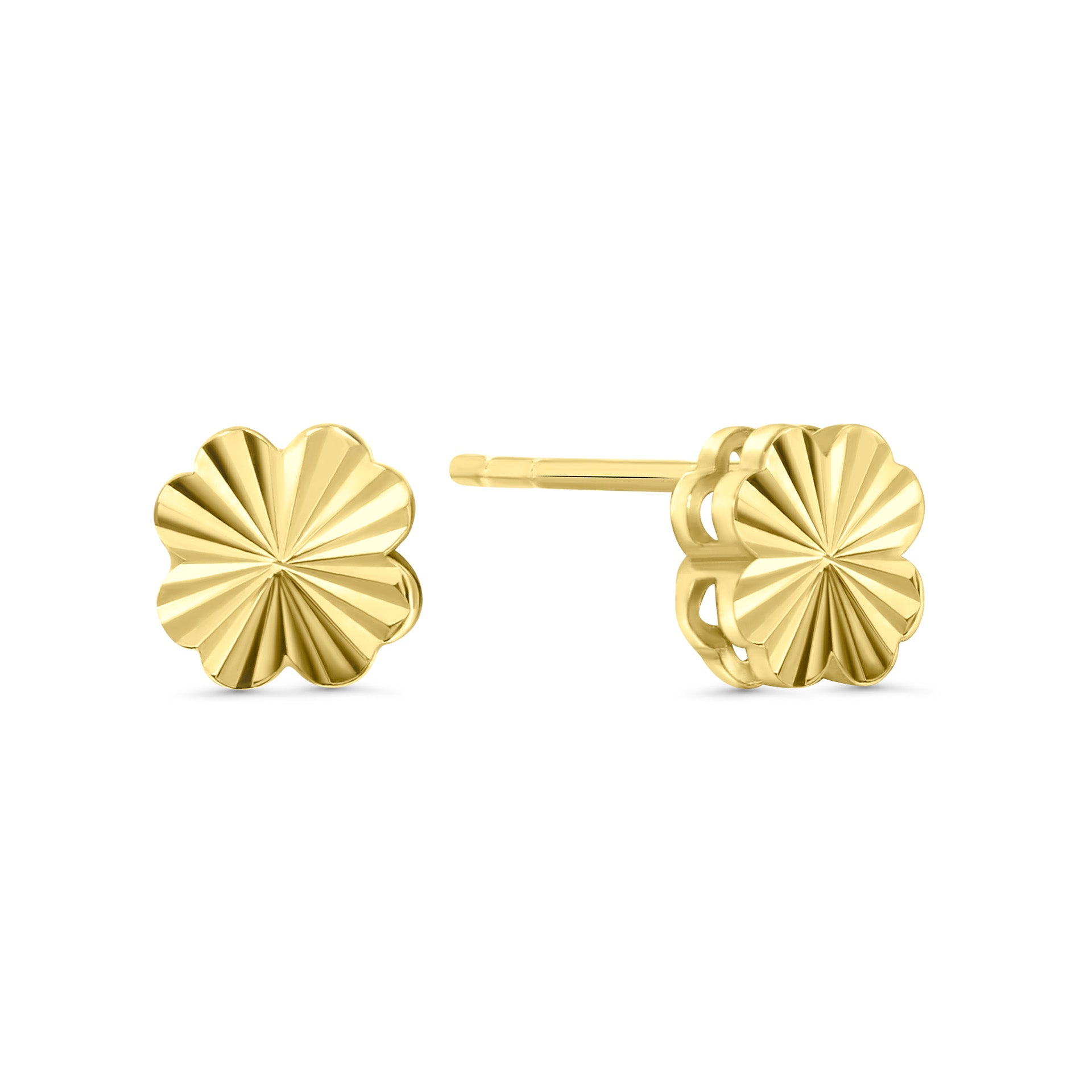 Cercei stud din aur galben din colectia Gold by Siebel. Acesti cercei tip stift sunt confectionati din aur galben de 14 karate si au forma unui trifoi. Au un finisaj taiat cu diamant. Asociati-le cu alte bijuterii din colectie.