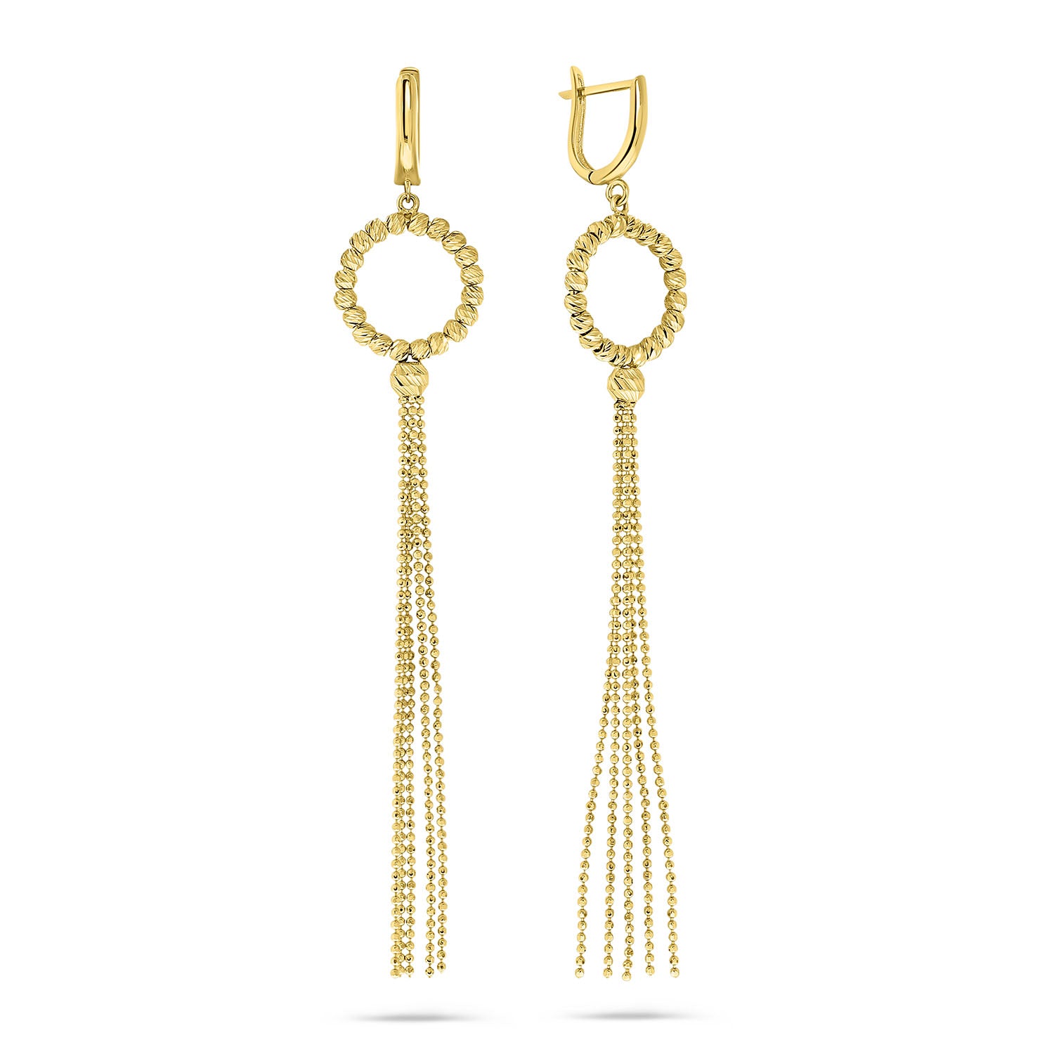 Cercei din aur galben din colectia Gold by Siebel. Realizati din aur galben de 14 karate, acesti cercei au un pandantiv frumos. Pandantivul rotund prezinta margele cu finisaj taiat in diamant si este atasat de un ciucuri fermecator.