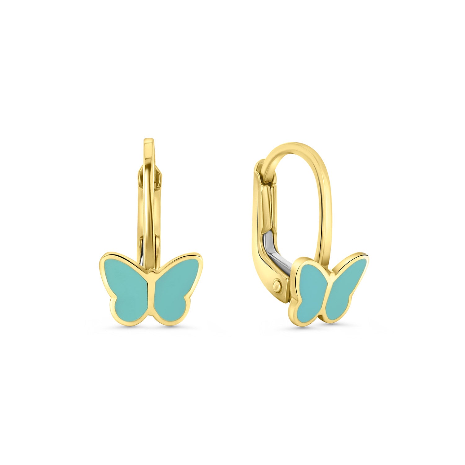 Cercei din aur galben din colectia Gold by Siebel. Realizati din aur galben de 14 karate, acesti cercei au o forma de fluture cu email albastru. Asociati acesti cercei cu alte bijuterii din colectie.