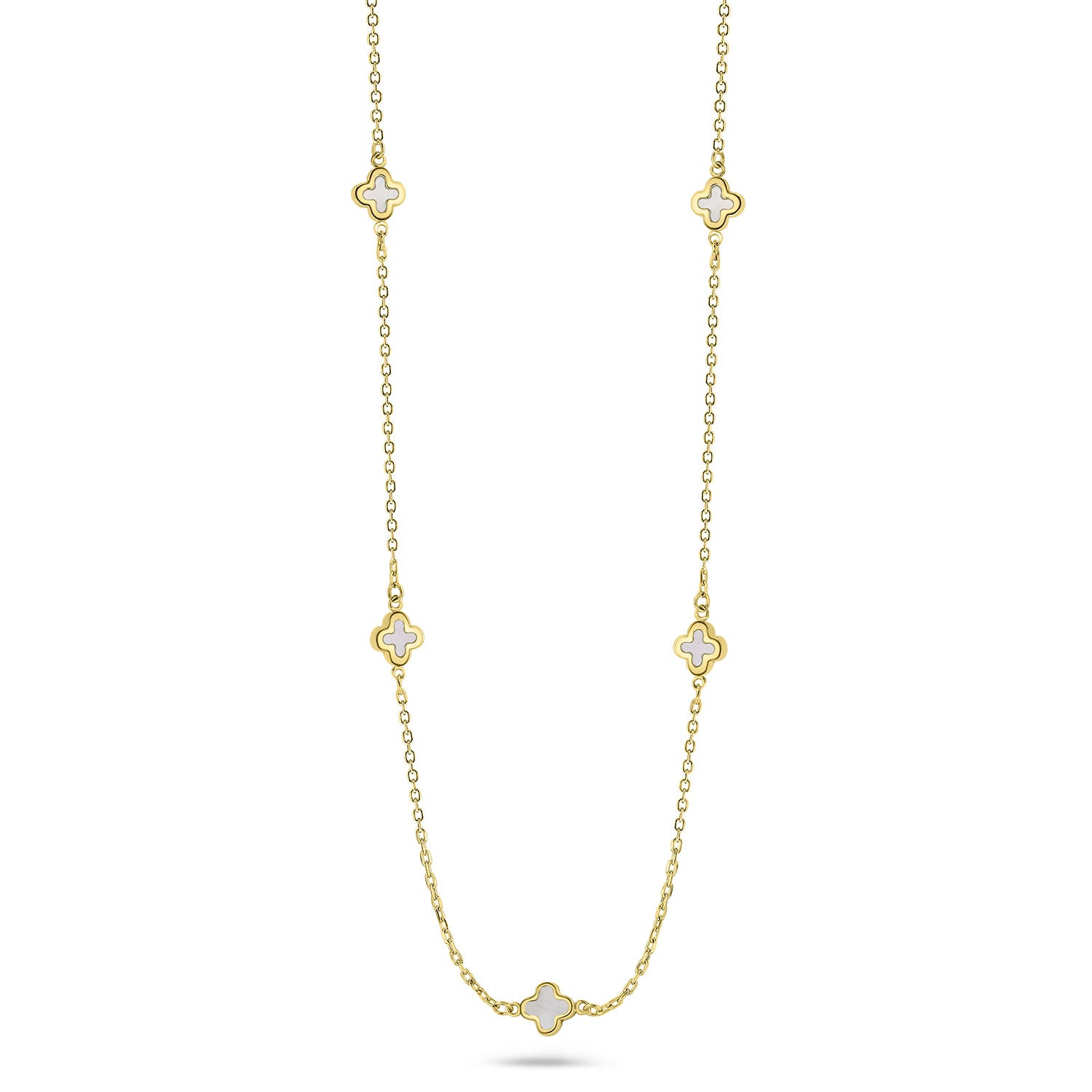 Acest colier delicat din aur de la Gold by Siebel este realizat din aur galben de 14 karate si masoara 45 cm lungime. Designul prezinta elemente in forma de trifoi, fiecare impodobita cu o incrustatie de sidef orbitoare care capteaza lumina intr-un mod captivant. Stralucirea moale si modelul jucaus al trifoiilor confera acestei piese un aspect romantic si luxos. Un colier frumos care adauga o eleganta fara efort oricarei tinute.