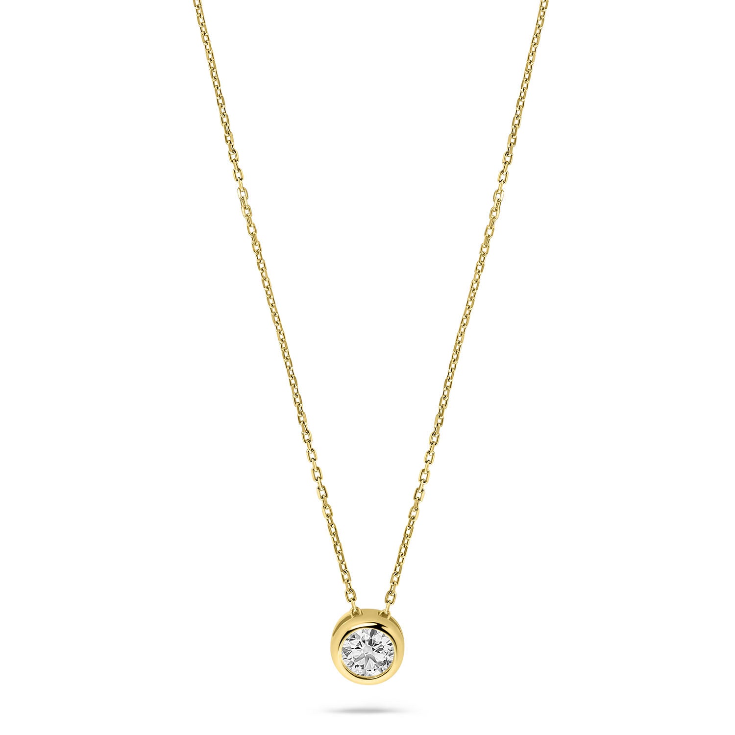 Colier din aur galben cu pandantiv rotund setat cu zirconiu din colectia Gold by Siebel. Fabricat din aur galben de 14 karate, colierul are un zirconiu uimitor. Lantul are 45 cm lungime. Combinati colierul cu bijuterii asortate din colectie pentru a completa aspectul.