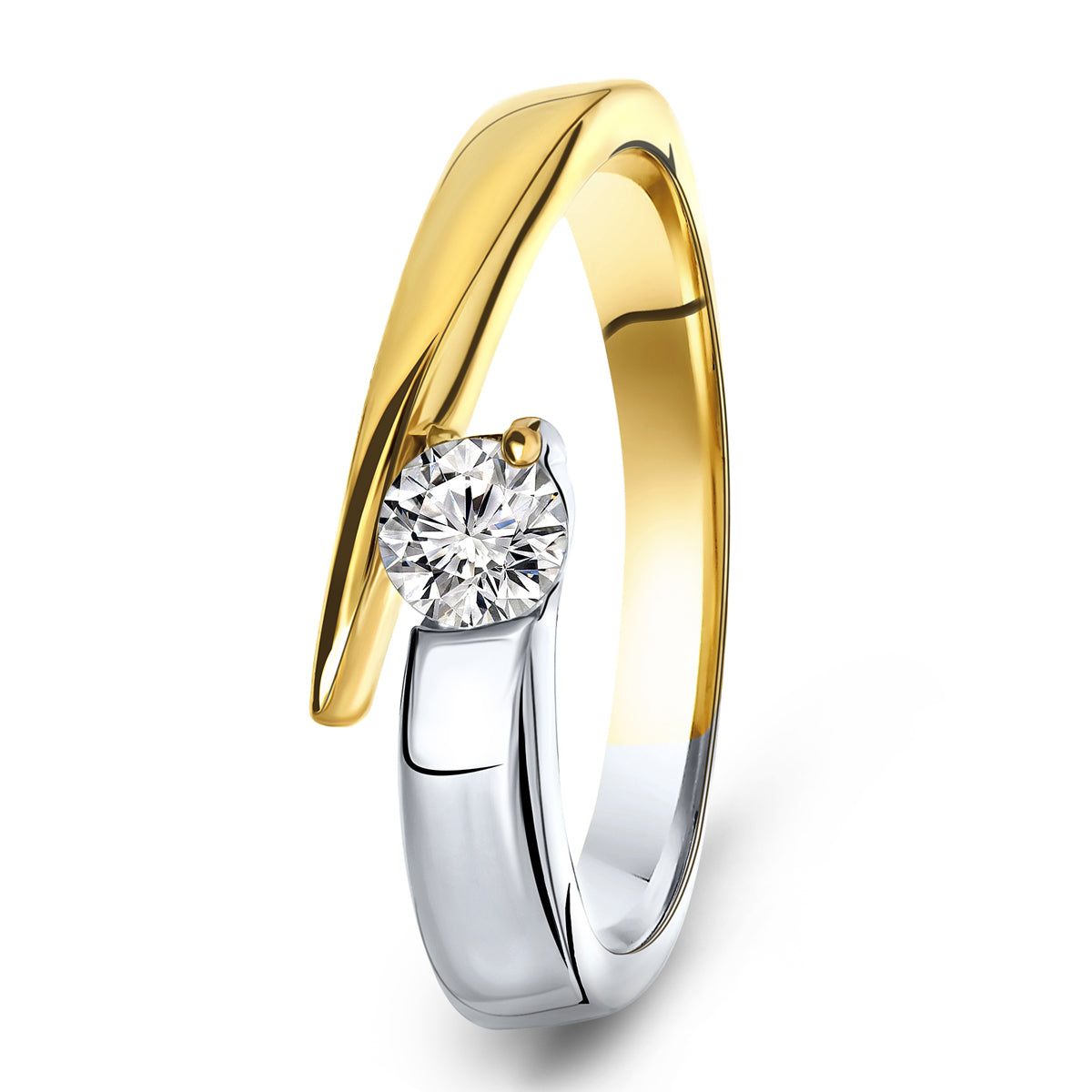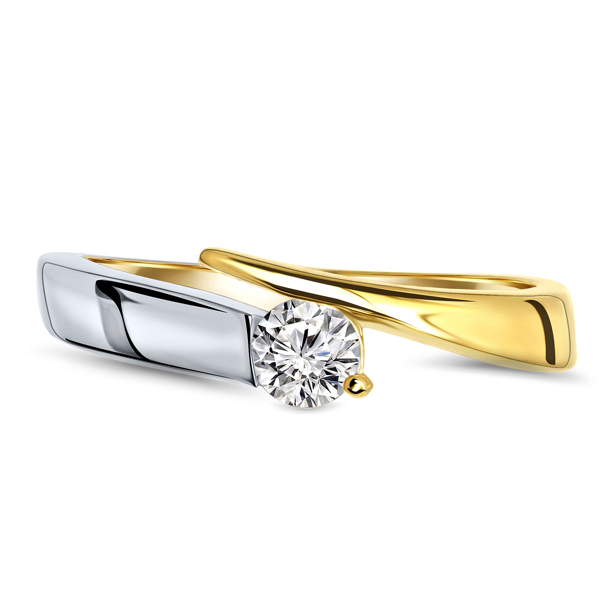 Inel bicolor din colectia Gold by Siebel. Acest inel este jumatate din aur alb si jumatate din aur galben. Partea din fata a inelului este fixata cu un singur zirconiu.