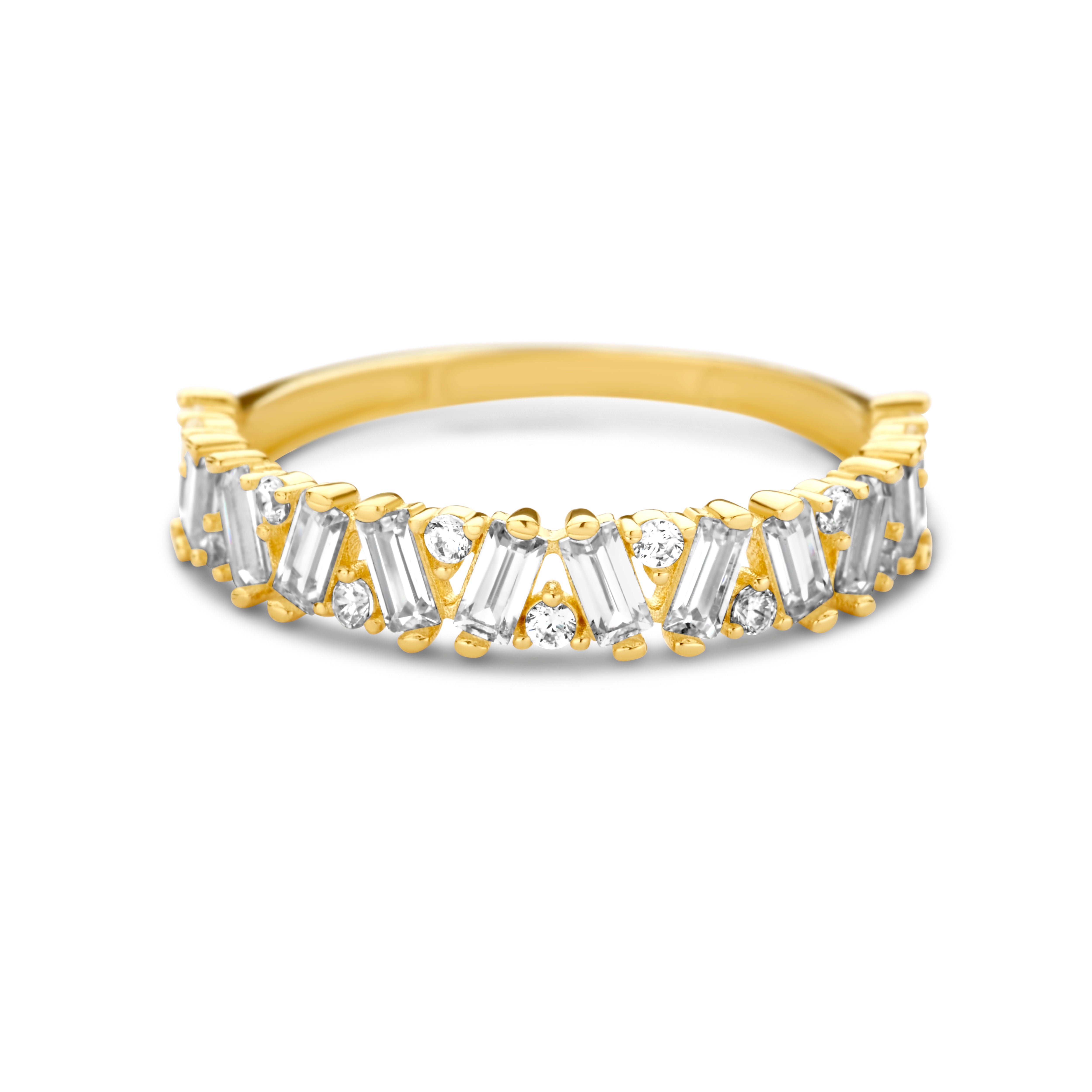 Inel din aur galben cu bagheta si zirconiu taiat stralucitor din colectia Gold by Siebel. Fabricat din aur galben de 14 karate, inelul este sertat atat cu zirconiu taiat stralucitor, cat si taiat bagheta. Este perfect pentru a fi combinat cu alte bijuterii din colectie.
