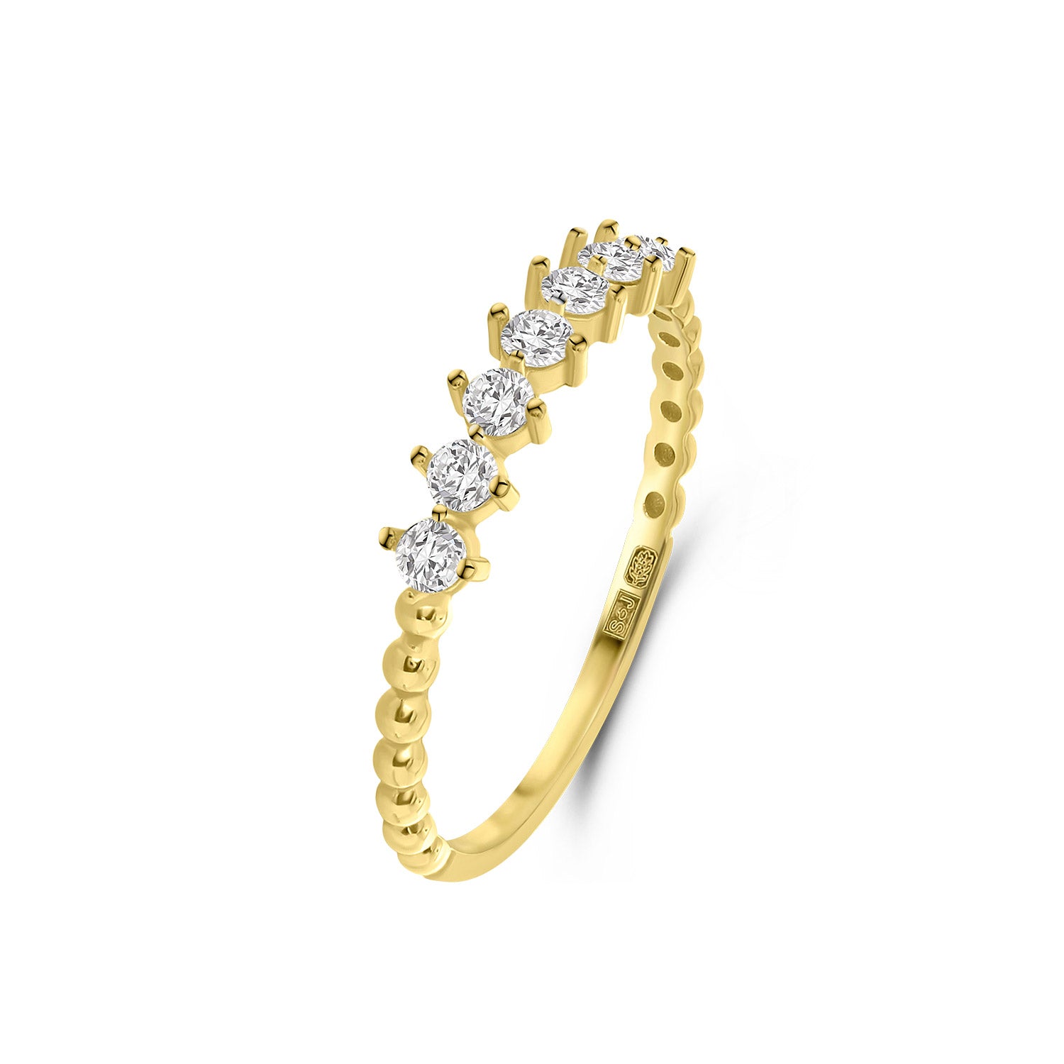 Inel din aur galben cu zirconiu si margele mici din colectia Gold by Siebel. Confectionat din aur galben de 14 karate, inelul are sapte pietre de zirconiu stralucitoare in centru. Banda are forma unor margele stralucitoare de ambele parti ale pietrelor de zirconiu. Asociati acest inel cu alte bijuterii din colectie.