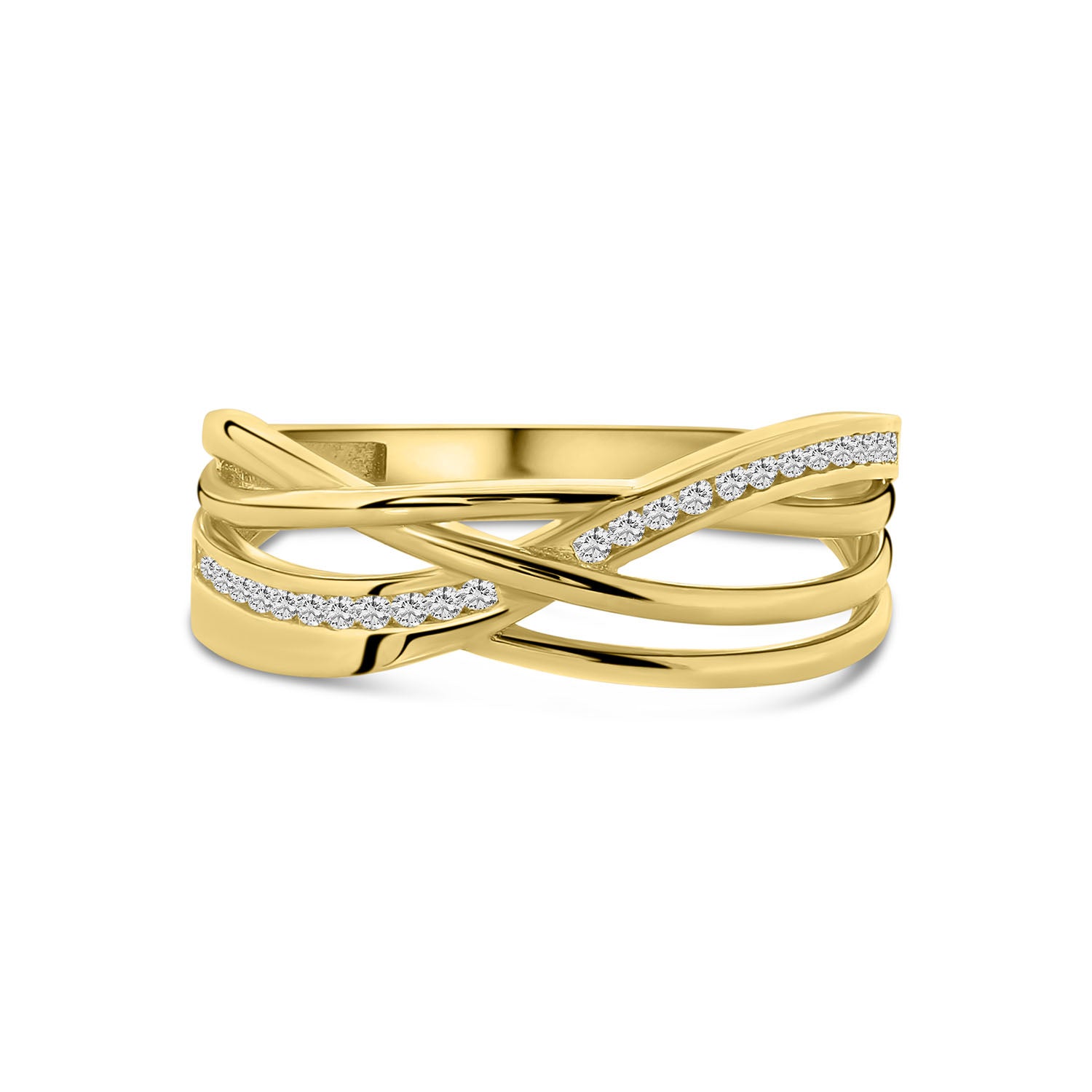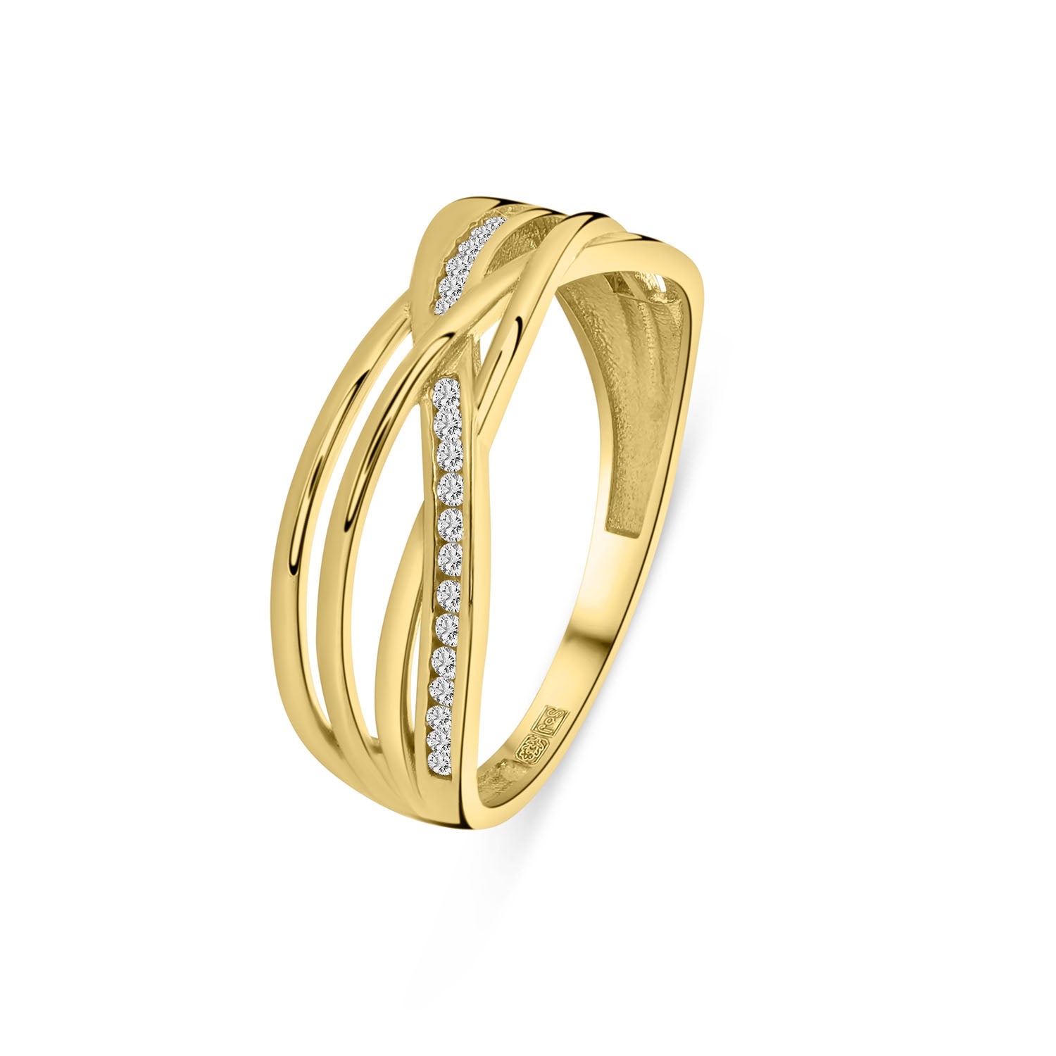 Inel din aur galben de 14 karate din colectia Gold by Siebel. Set cu 25 de pietre mici de zirconiu cubic. Formele unde deschise ofera inelului un aspect gratios si atemporal.