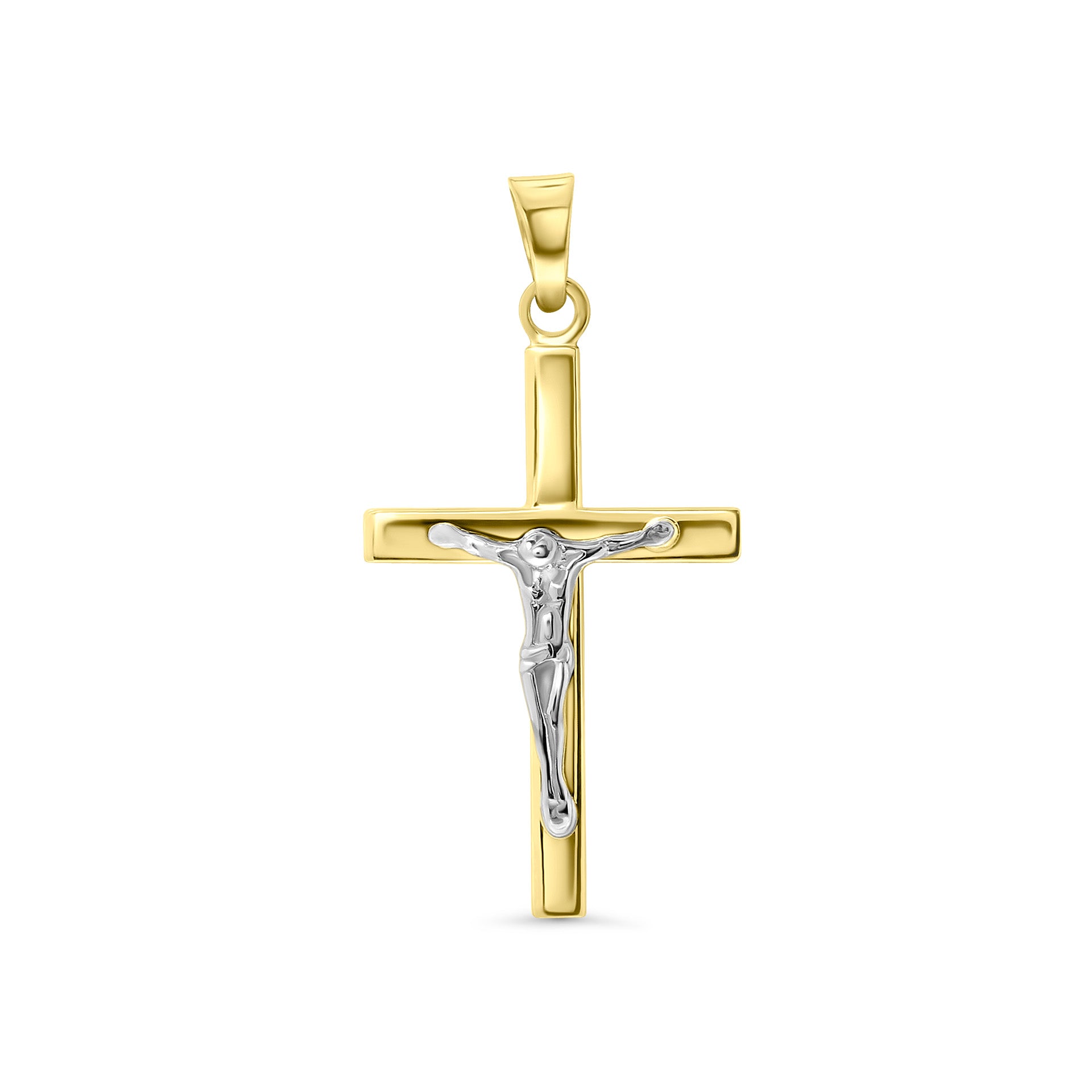 Pandantiv in doua tonuri din colectia Gold by Siebel. Acest pandantiv este realizat din aur galben si alb de 14 karate. Are forma unei cruci cu o statuie din aur alb a lui Isus. Asociati pandantivul cu un lant de aur elegant.