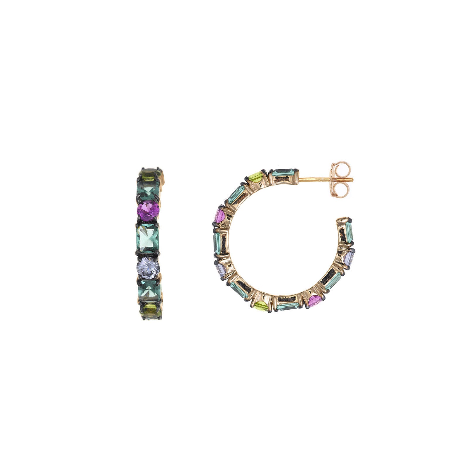 Cercei din argint 925, placati cu aur roz, din colectia Slavatore Plata. Cerceii prezinta turmalina, peridot, zirconiu si bian. Diametrul cerceilor este de 2,5 cm.