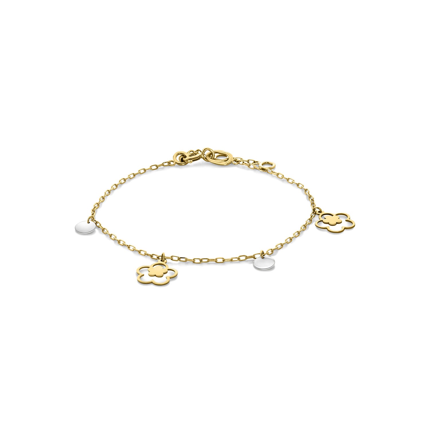 Bratara cu farmec din aur galben din colectia Gold by Siebel. Fabricata din aur galben de 14 karate, bratara este decorata cu brelocuri florale si discuri din aur alb. Bratara are 17 cm lungime.