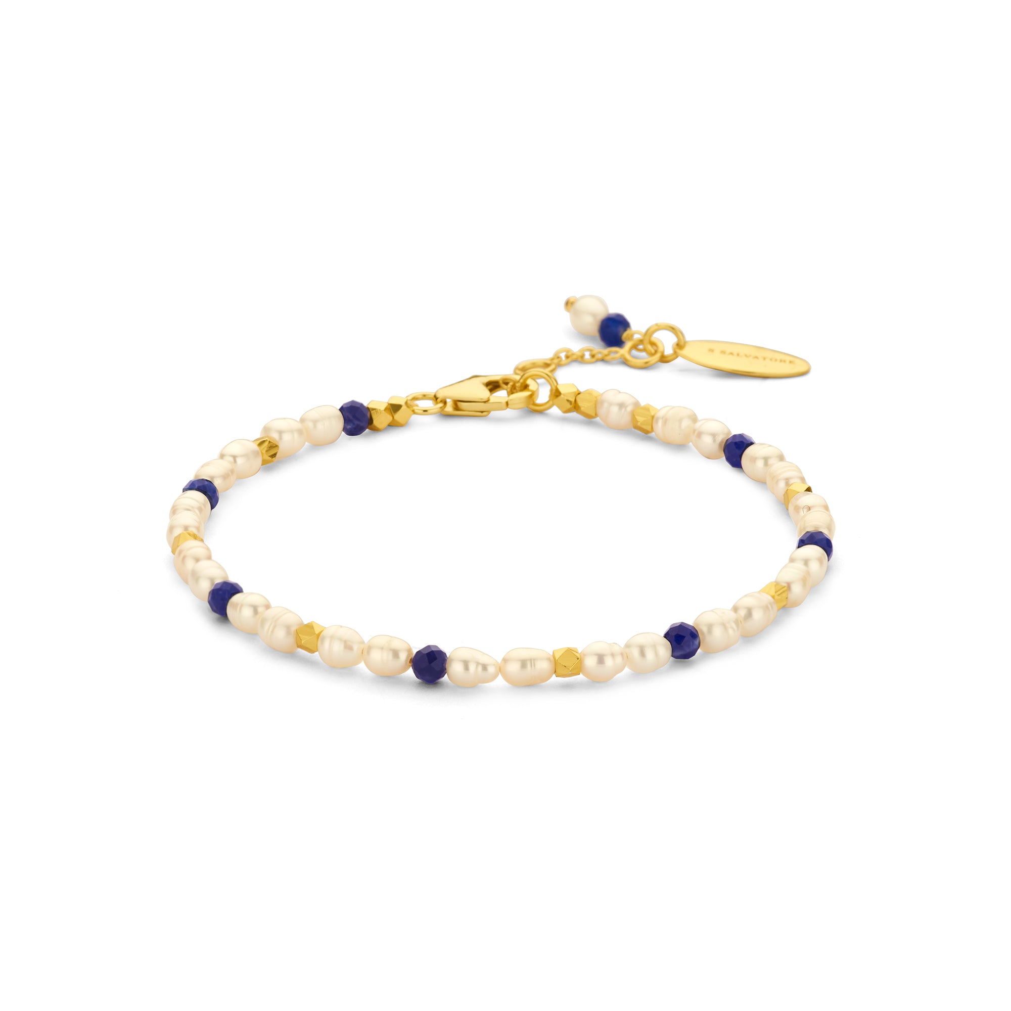 Aceasta bratara rafinata cu margele de la Salvatore Plata este realizata din argint 925 si este placata cu aur. Cu o lungime de 20 cm si un prelungitor, se potriveste perfect pe orice incheietura. Combinatia de perle de apa dulce si pietre de sodalit albastru adauga o nota eleganta si mistica. Perlele de apa dulce emana un farmec clasic, in timp ce pietrele de sodalit albastru, cu culoarea lor profunda si proprietatile lor calmante, aduc o nota de liniste.