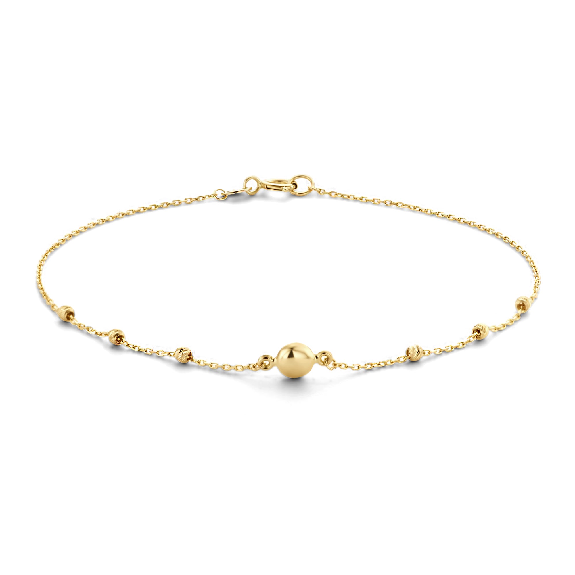 Bratara din aur galben de 14 karate de la Gold by Siebel. Aceasta bratara eleganta are o piesa rotunda de aur lustruita in centru, inconjurata de sase bile de aur cu fatete mici. Bratara are 19 cm lungime, piesa centrala are 4,5 mm latime, iar bilele mici au 1,9 mm latime. Legatura are o grosime de 0,95 mm.