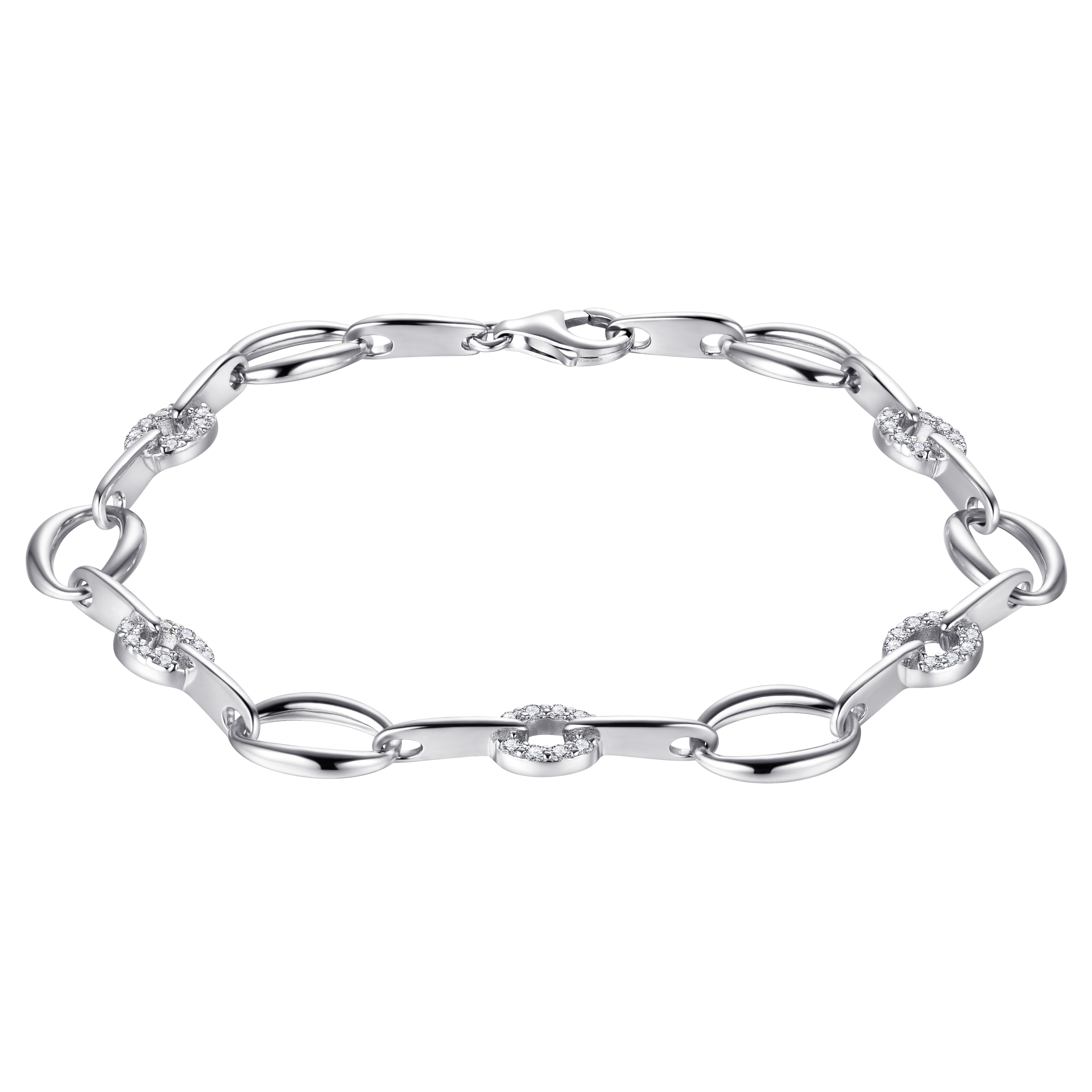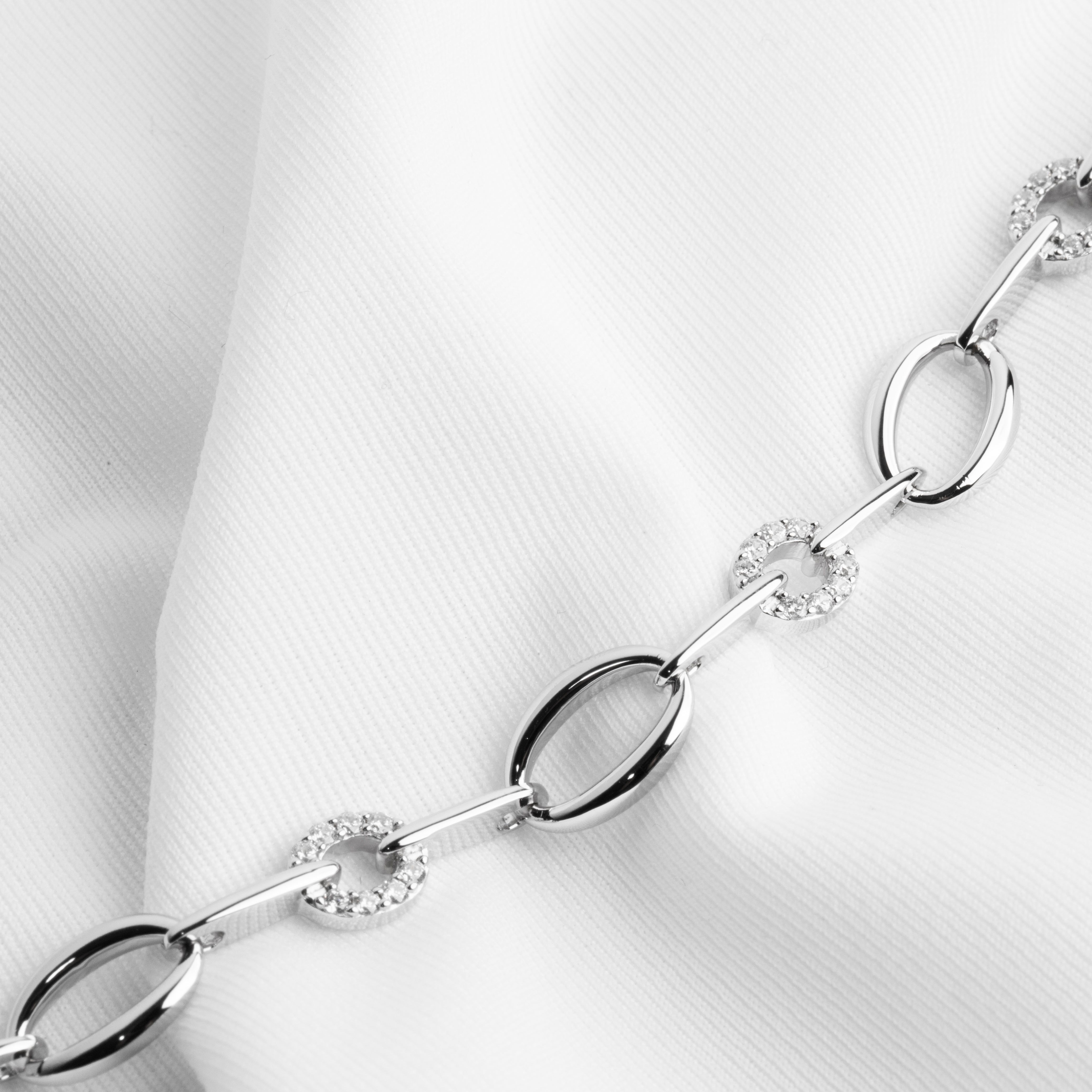 Aceasta bratara unica de zale din colectia noastra Elena este realizata din argint 925. O rasucire a bratarilor clasice cu linkuri, este impodobita cu pietre de zirconiu, dandu-i un aspect proaspat si sic. Este perfect pentru asociere cu alte bratari sau bijuterii din colectie.