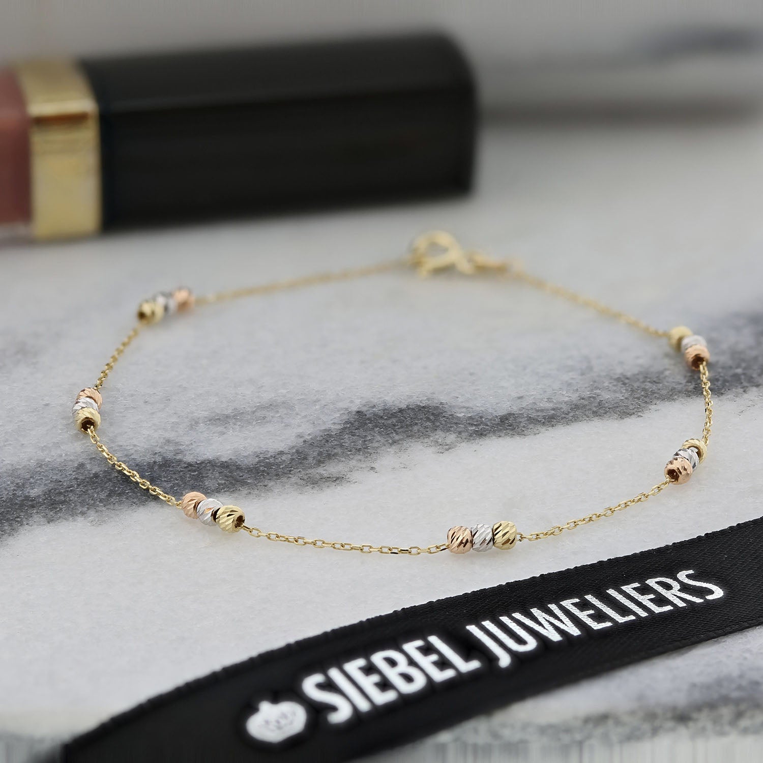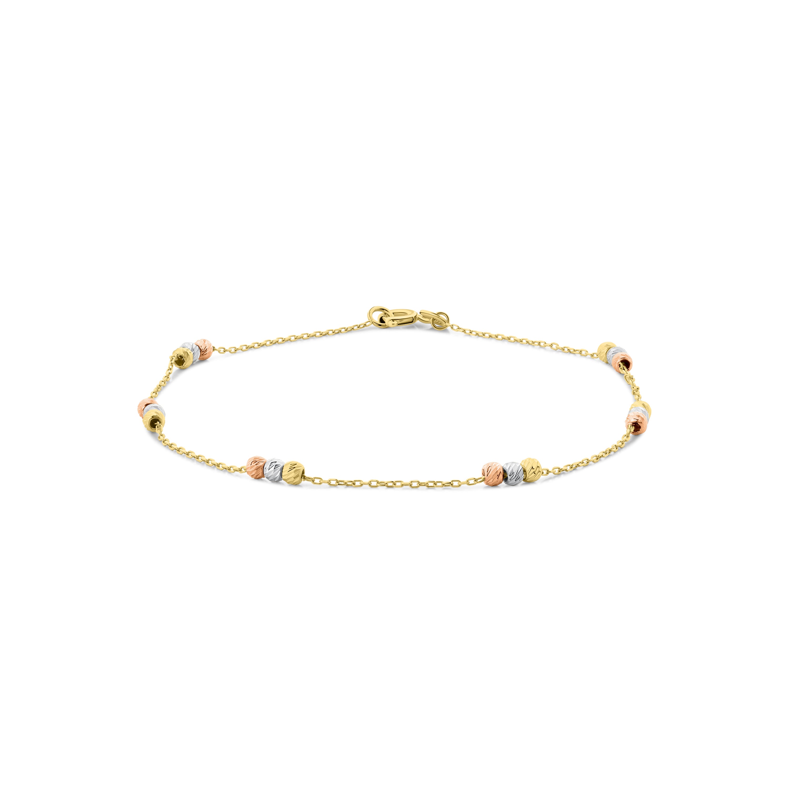 Bratara din aur galben cu margele tricolore din colectia Gold by Siebel. Fabricata din aur galben de 14 karate, bratara este decorata cu 18 margele taiate cu diamante din aur galben, alb si roz, fiecare cu finisaj diamant. Bratara are 19 cm lungime.