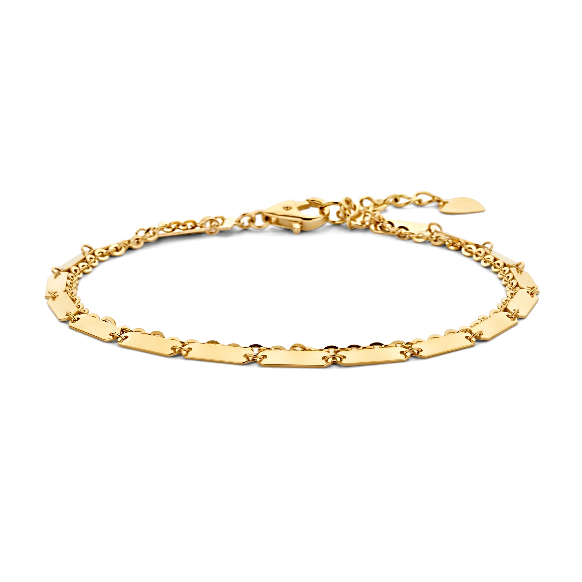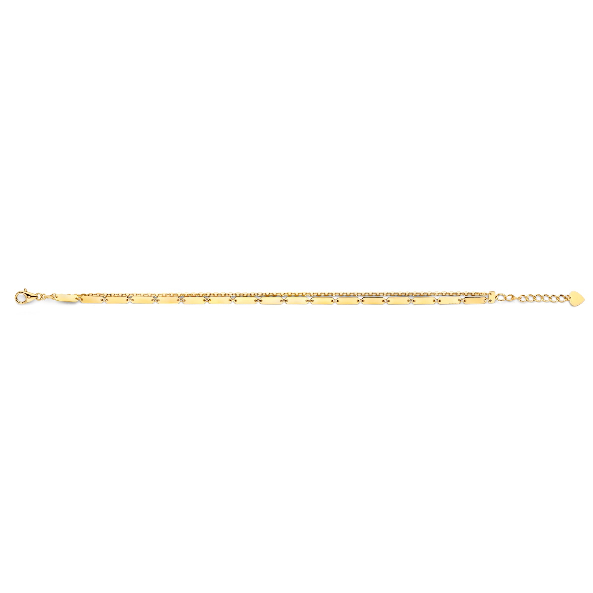 Bratara din aur galben de 14 karate din colectia Gold by Siebel. Bratara este formata din doua lanturi. Un lant are placi dreptunghiulare, in timp ce celalalt lant este format din zale. Bratara are o lungime de 18 cm si o extensie de 2 cm. Latimea piesei este de 4,6 mm si grosimea de 0,42 mm.