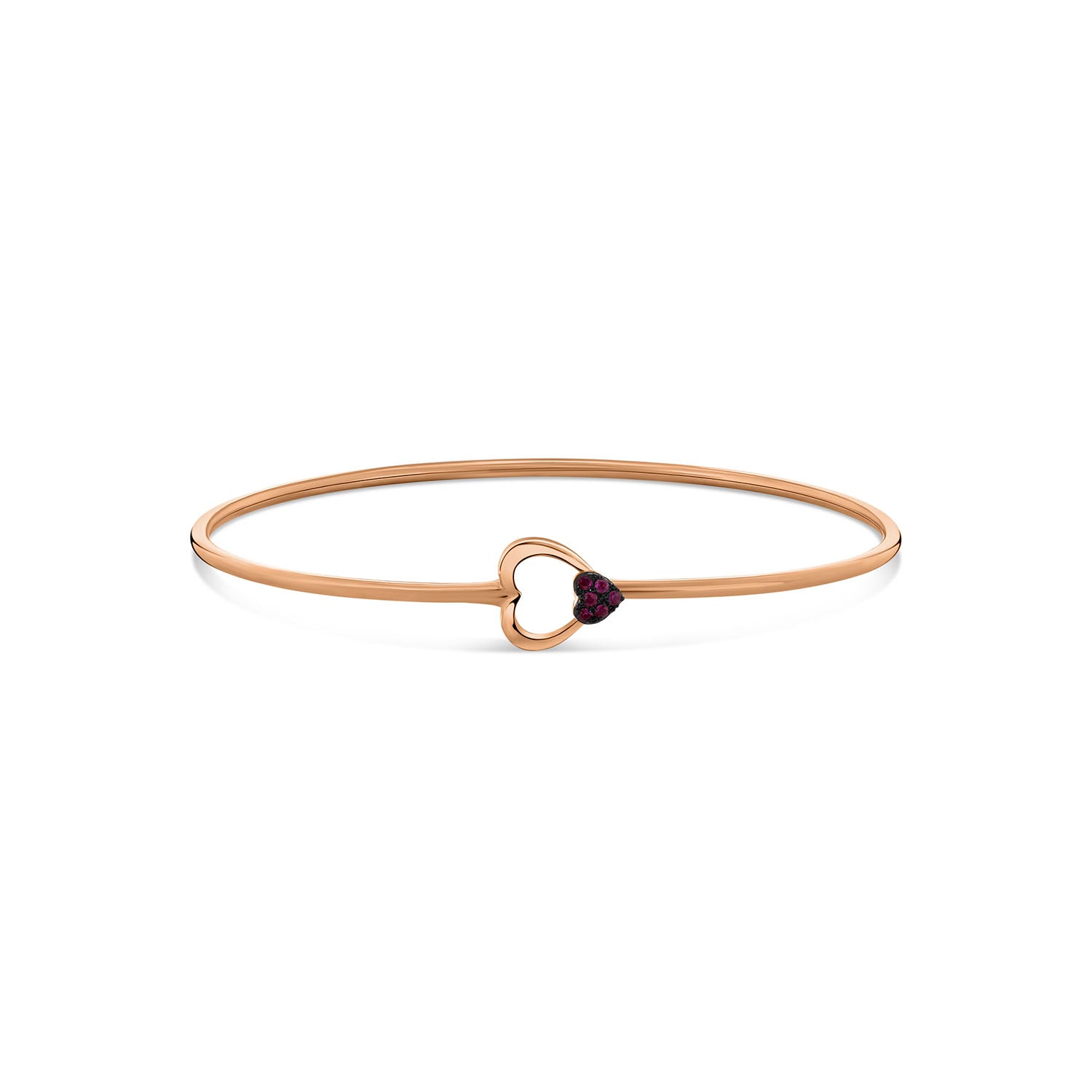 Bratara din aur roz rubin din colectia Diamonds by Siebel. Aceasta bratara rafinata este realizata din aur roz de 14 karate si are ca piesa centrala o inima deschisa eleganta. Langa inima deschisa, un element mai mic in forma de inima straluceste, asezat cu sase rubine rotunde, adaugand caldura si culoare designului. Stralucirea moale a aurului trandafir si nuanta rosu intens a rubinelor creeaza un intreg armonios. O bijuterie gratioasa si semnificativa, care combina subtil dragostea si rafinamentul.