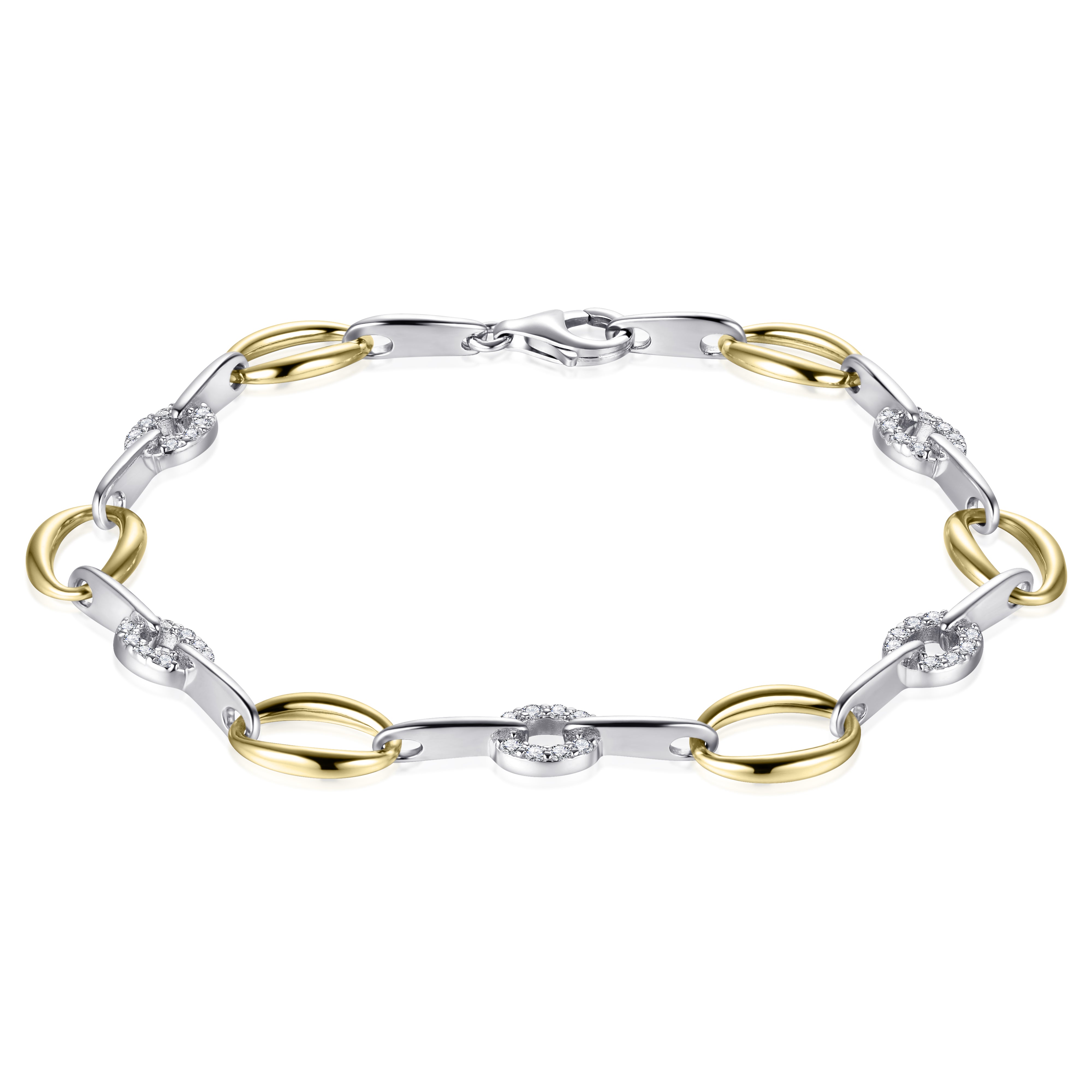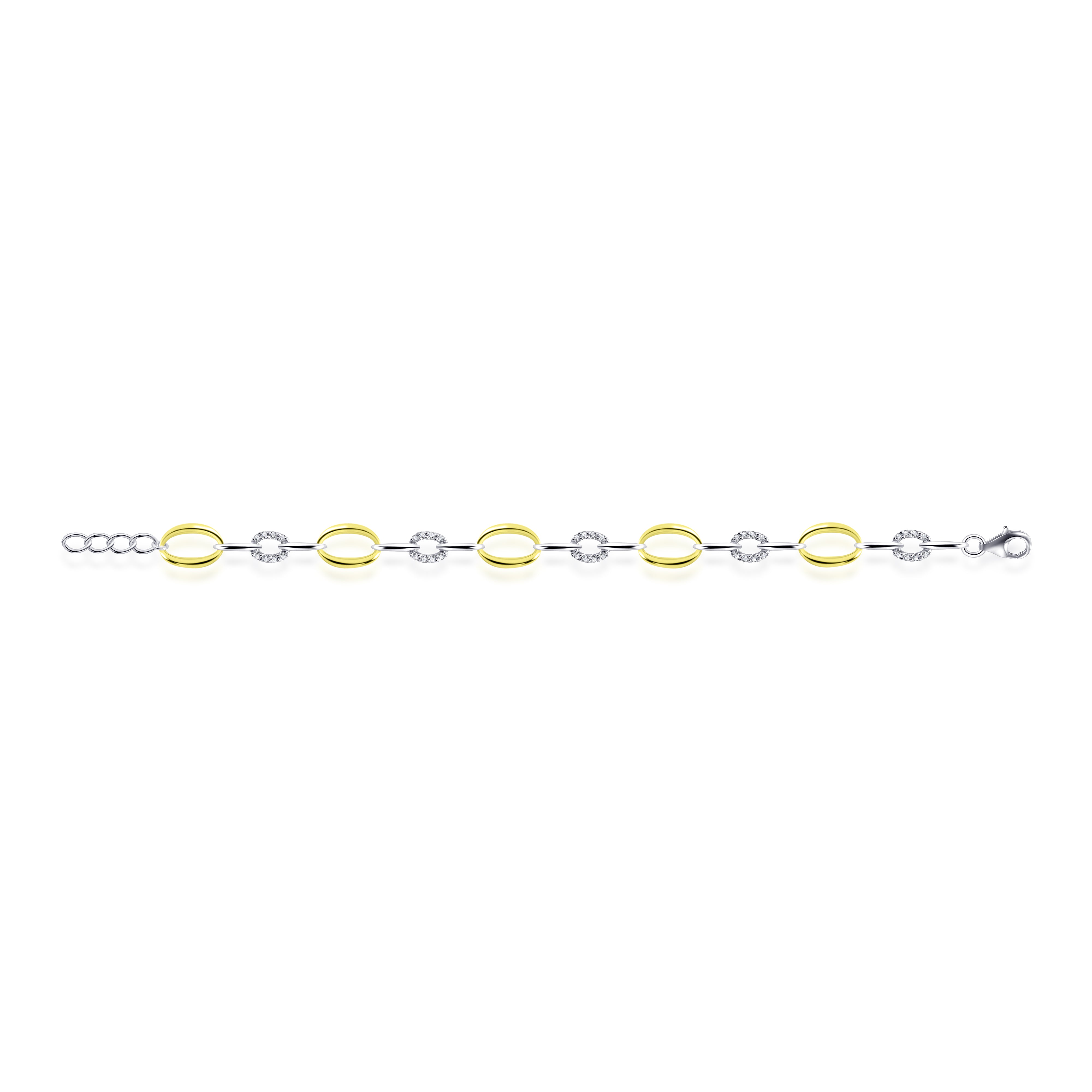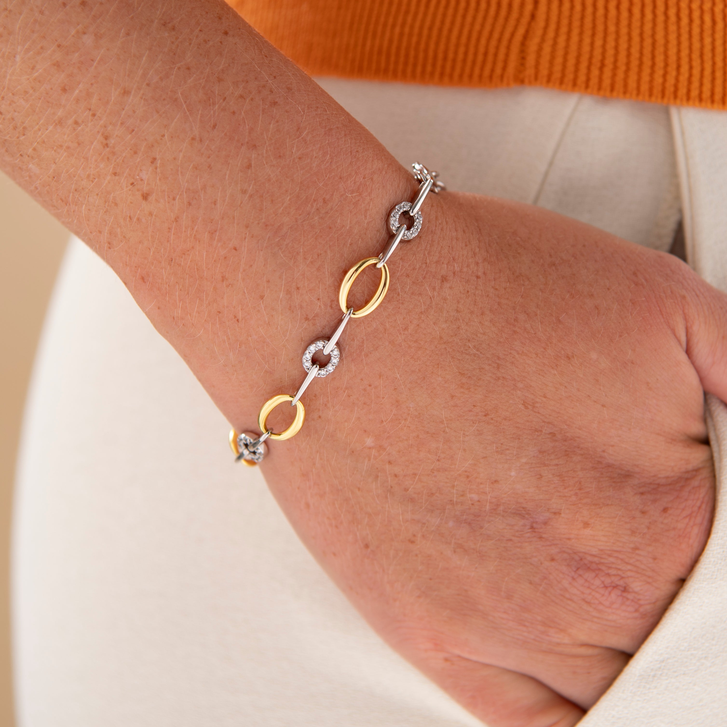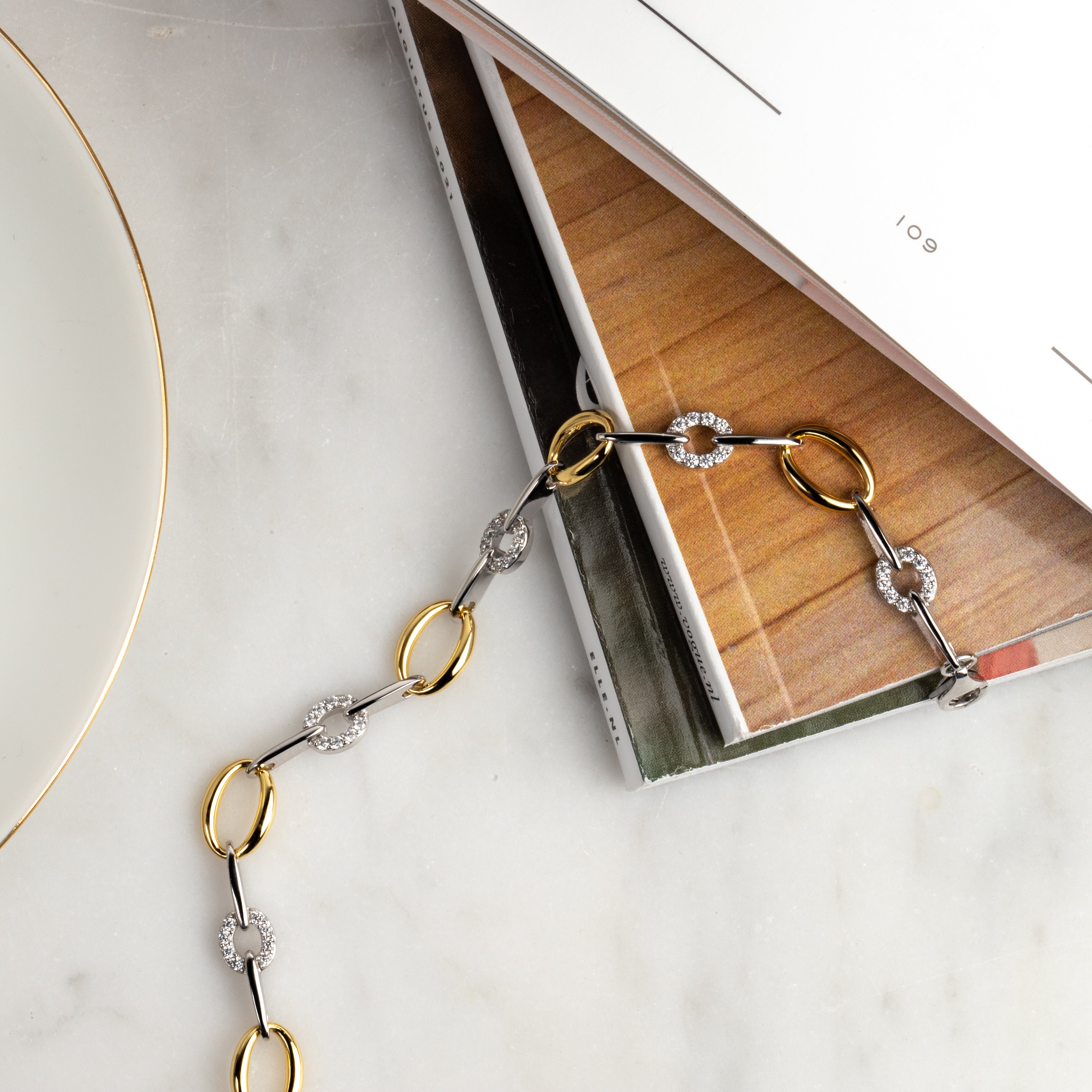 Aceasta bratara unica de zale din colectia noastra Elena este realizata din argint 925 si partial placata cu aur. O rasucire a bratarilor clasice cu linkuri, este impodobita cu pietre de zirconiu, dandu-i un aspect proaspat si sic. Este perfect pentru a fi combinat cu alte bratari sau bijuterii din colectie.