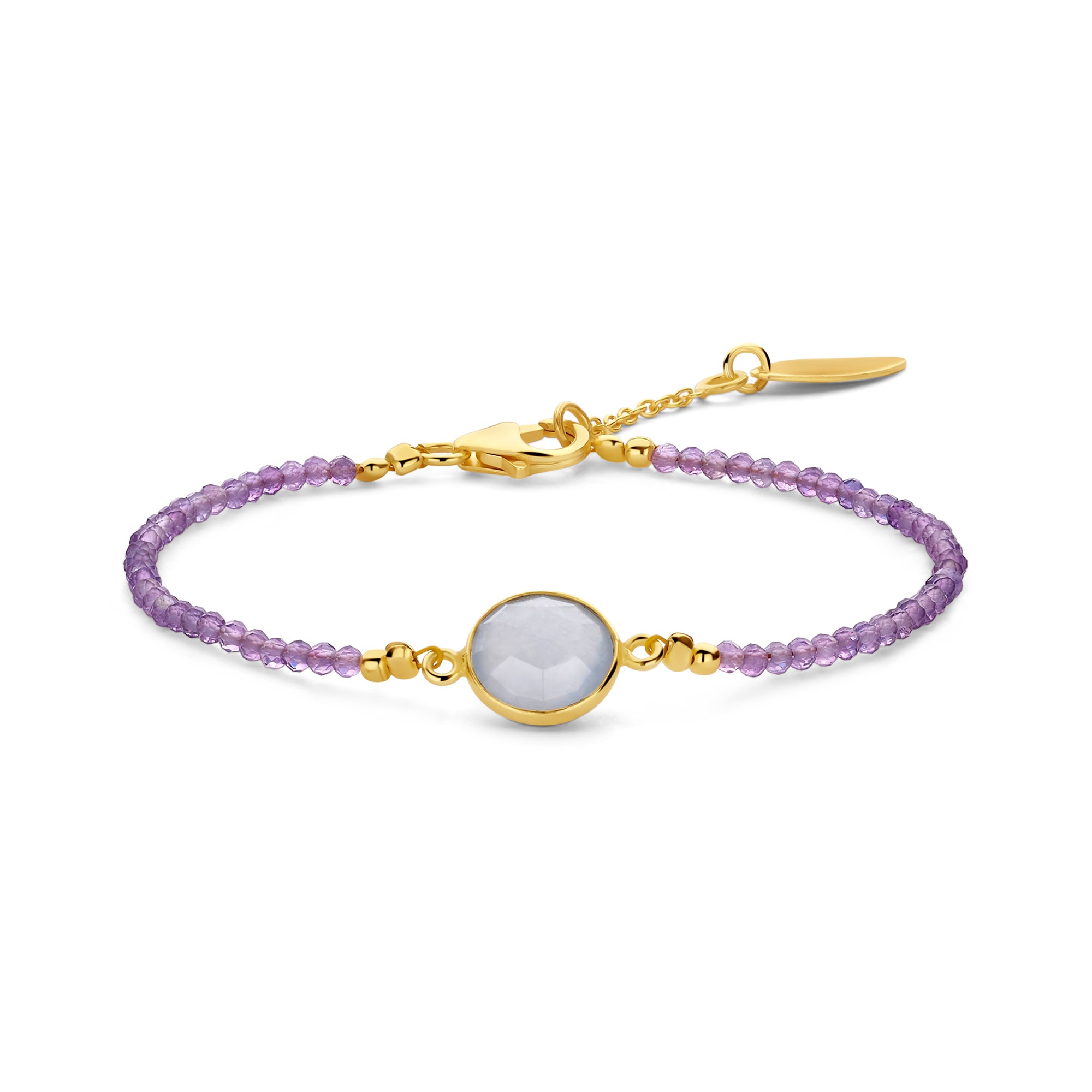 Cu o nuanta delicata si un aspect rafinat, aceasta eleganta bratara Salvatore emana liniste, farmec si lux. Realizata din argint sterling 925 de inalta calitate, cu un finisaj placat cu aur lucios, aceasta piesa atrage subtil atentia in orice ocazie. Piatra centrala rotunda este un calcit verde deschis, cunoscut pentru energia sa calmanta si revigoranta. Este incadrata de accente aurii delicate si inconjurata de un rand de margele de ametist fatetate intr-o nuanta eleganta de lavanda. Lungimea reglabila de 18 pana la 21 cm face ca aceasta bratara sa fie potrivita pentru aproape orice incheietura a mainii. Poarta-o singura pentru un aspect minimalist sau combin-o cu alte bratari pentru un ansamblu jucaus si personalizat.