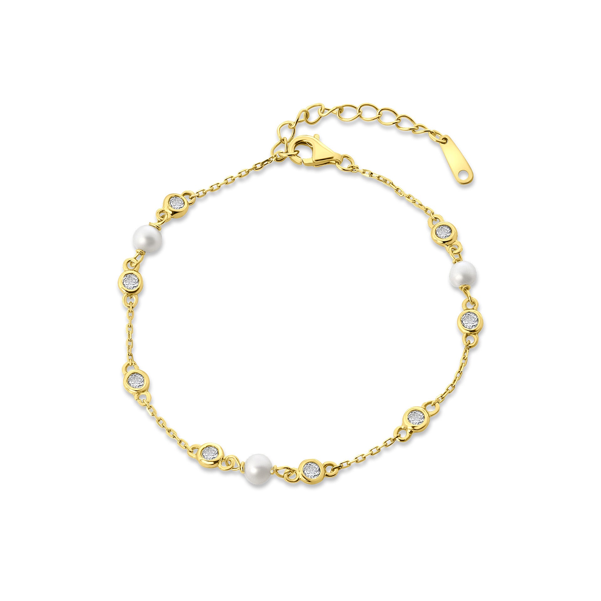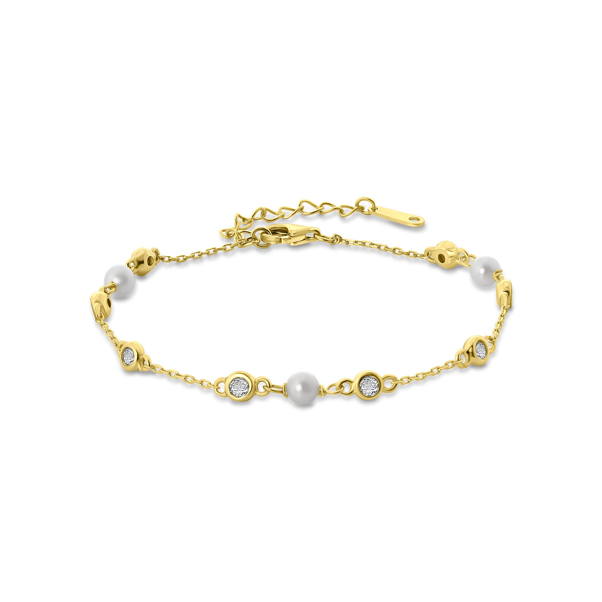 Adauga o nota de eleganta si stralucire look-ului tau cu aceasta bratara Salvatore Plata. Fabricat din argint 925 si placat cu aur, este impodobit cu trei perle mici si opt pietre de zirconiu. Este usor de combinat cu alte bratari si bijuterii din colectie.
