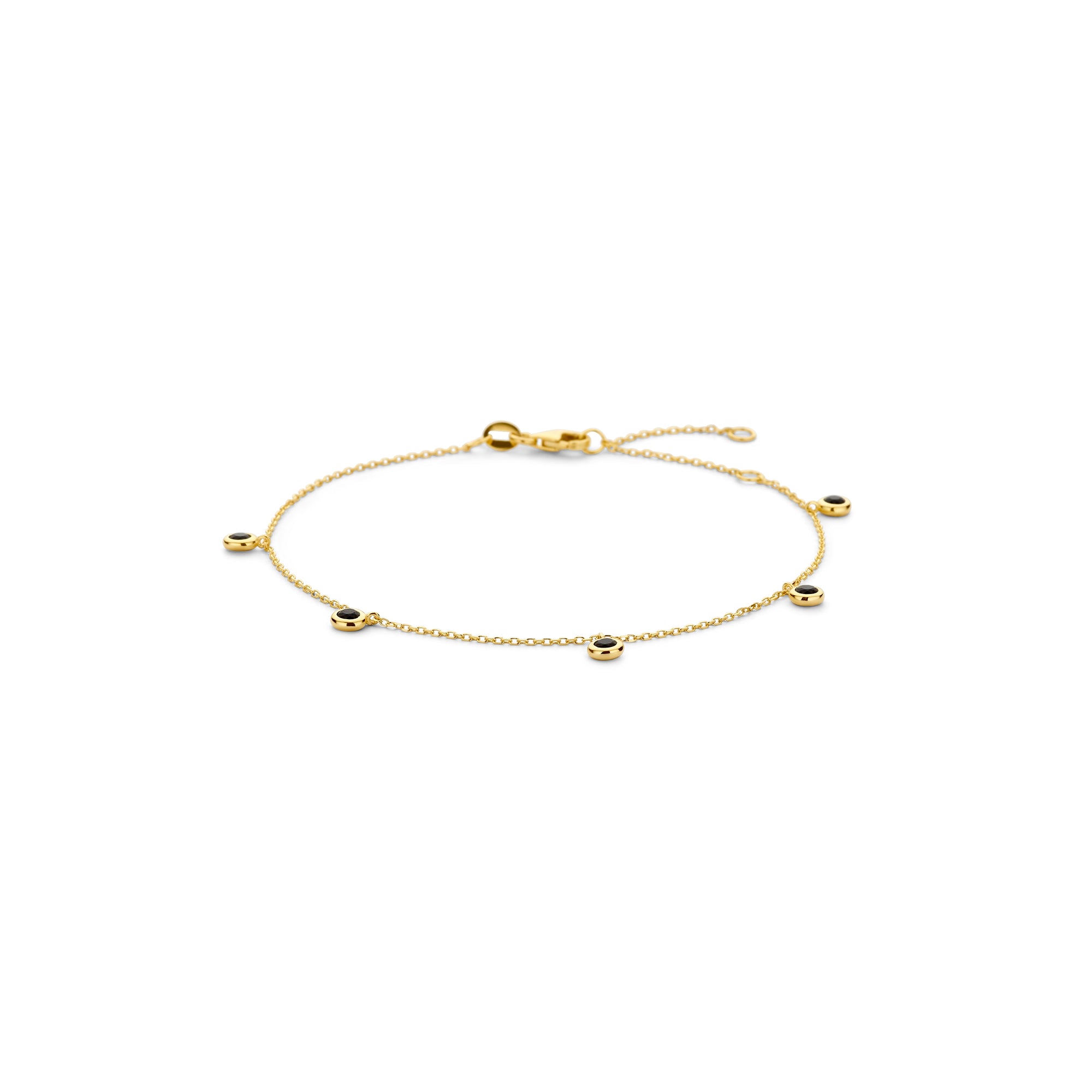 Descoperiti frumusetea subtila a bratarii noastre fin de aur galben, accentuata cu cinci pietre stralucitoare din zirconiu cubic negru. Aceasta bratara emana o eleganta atemporala si adauga o nota de rafinament stilului tau. Indiferent daca sarbatoresti o ocazie speciala sau iti imbunatatesti aspectul de zi cu zi, aceasta bratara este accesoriul perfect. Lasa-te sa stralucesti cu splendoarea discreta a acestei piese din aur galben, cu siguranta va intoarce capetele.