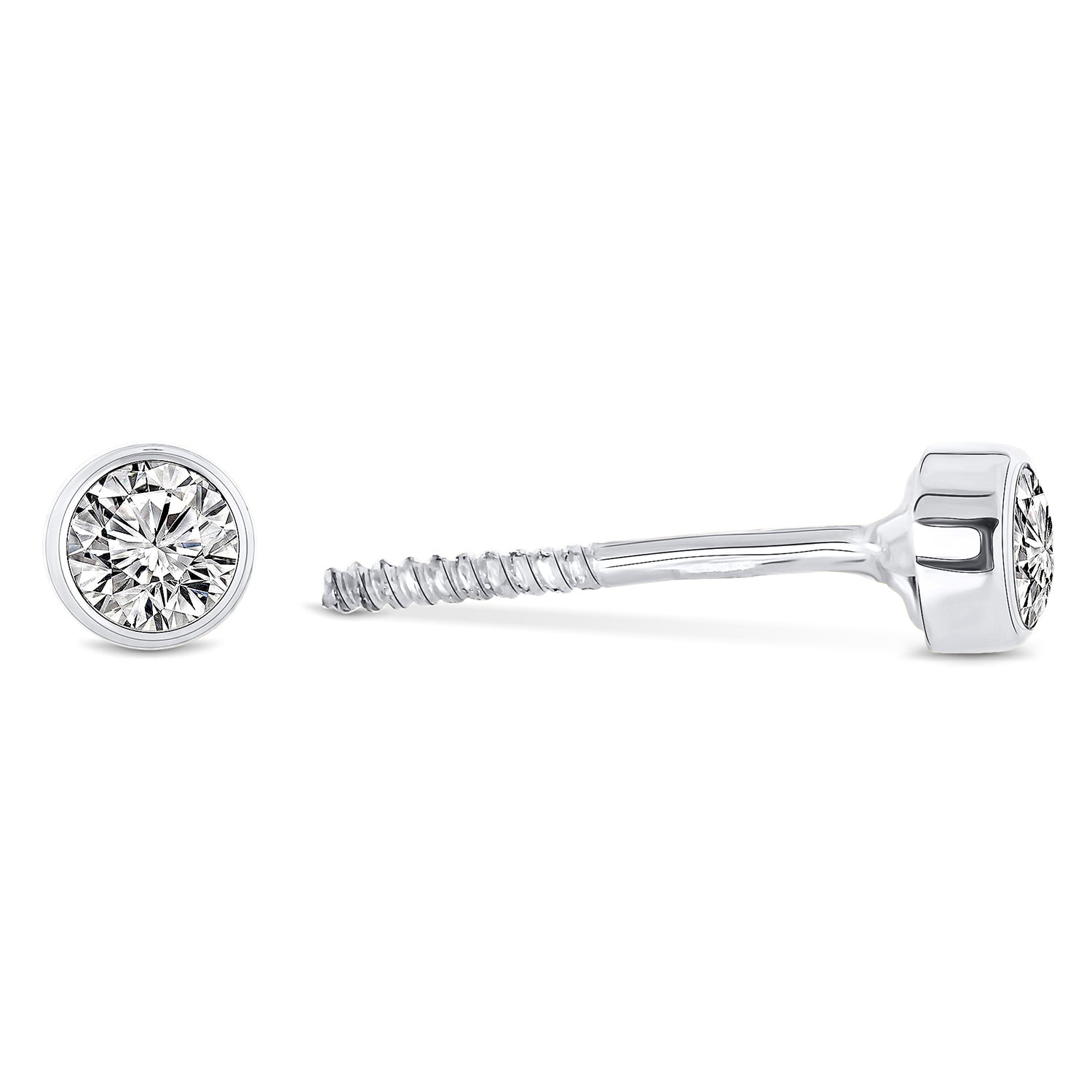 Cercei tip stift din aur alb de 14 karate din colectia By Nikki. Acesti cercei rotunzi sunt ambii impodobiti cu zirconiu.