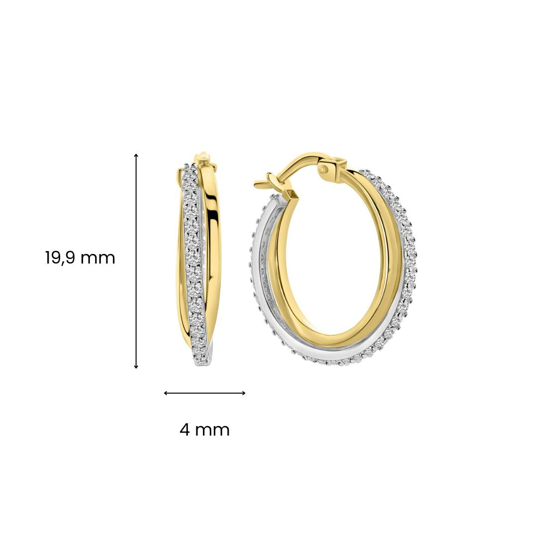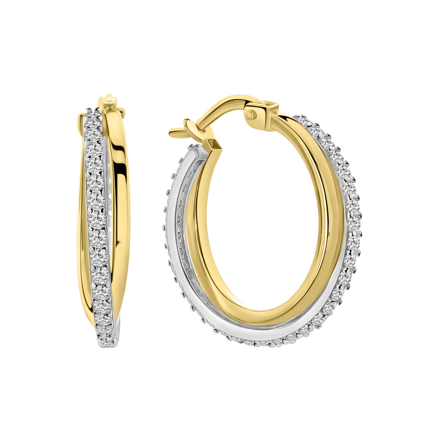 Cercei din aur bicolor cu zirconiu din colectia Gold by Siebel. Realizati din aur galben si alb de 14 karate, acesti cercei sunt inscrisi cu zirconiu. Combina-le cu alte bijuterii din colectie pentru a-ti completa look-ul.