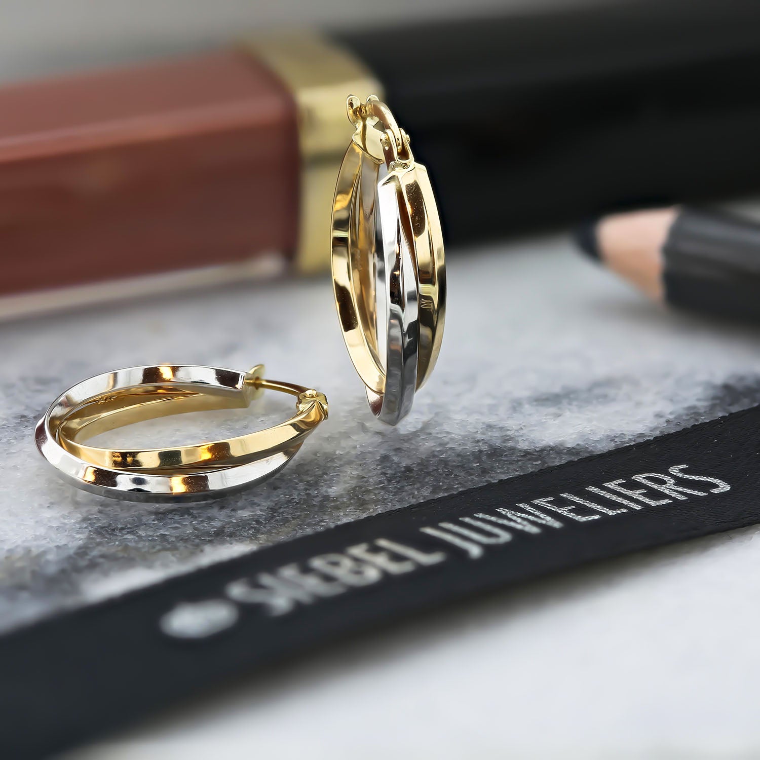 Cercei bicolor din colectia Twinline. Realizati din aur galben si alb de 14 karate, acesti cercei au un finisaj lustruit. Au o inchidere robusta care nu iti va infige in gat.