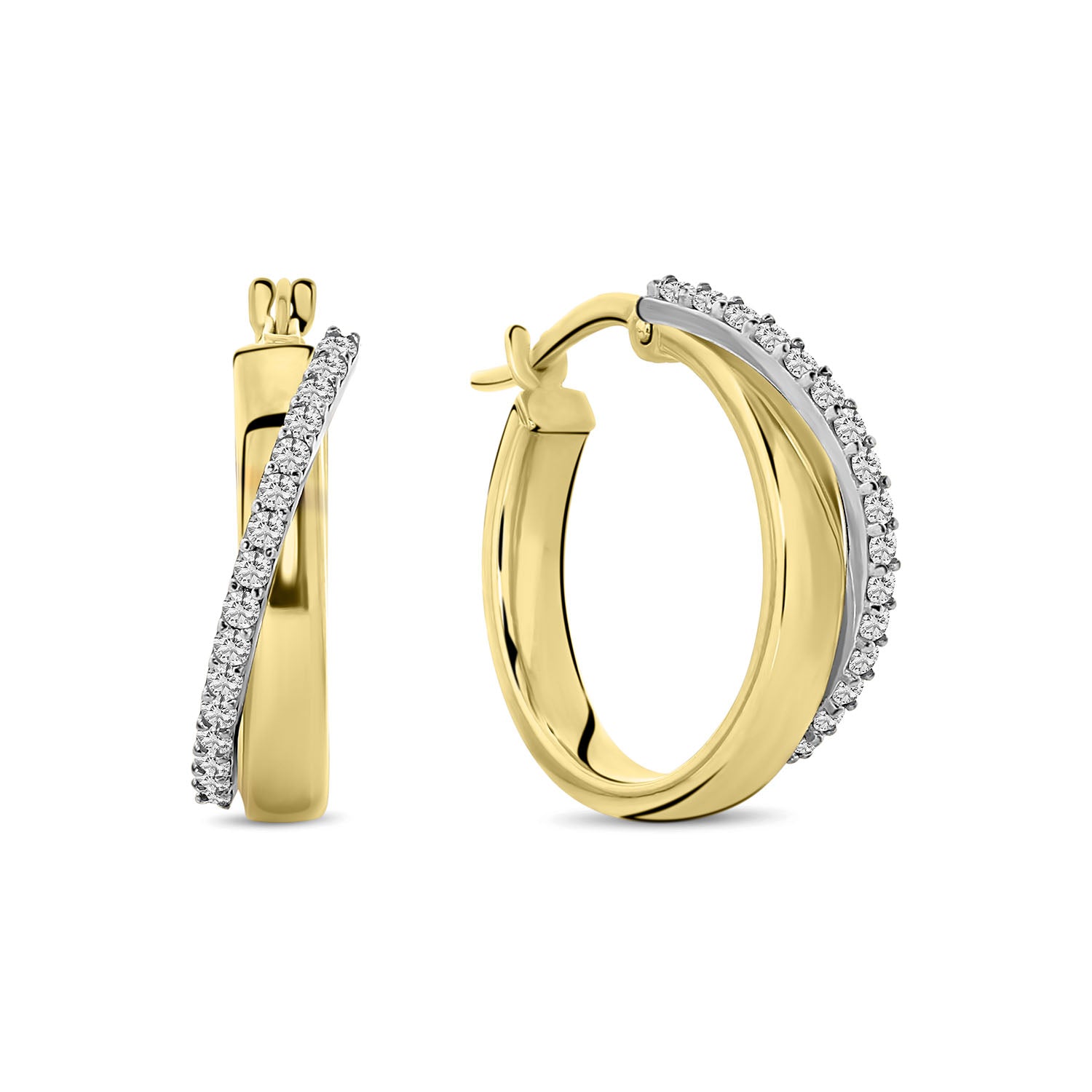 Cercei din zirconiu bicolor din colectia Twinline. Confectionati din aur galben si alb de 14 karate, acesti cercei sunt impodobiti cu pietre frumoase din zirconiu. Acestea au o inchidere cu parghie pentru pornire si dezactivare usoara. Asociati acesti cercei cu alte bijuterii din colectie pentru a va completa look-ul.