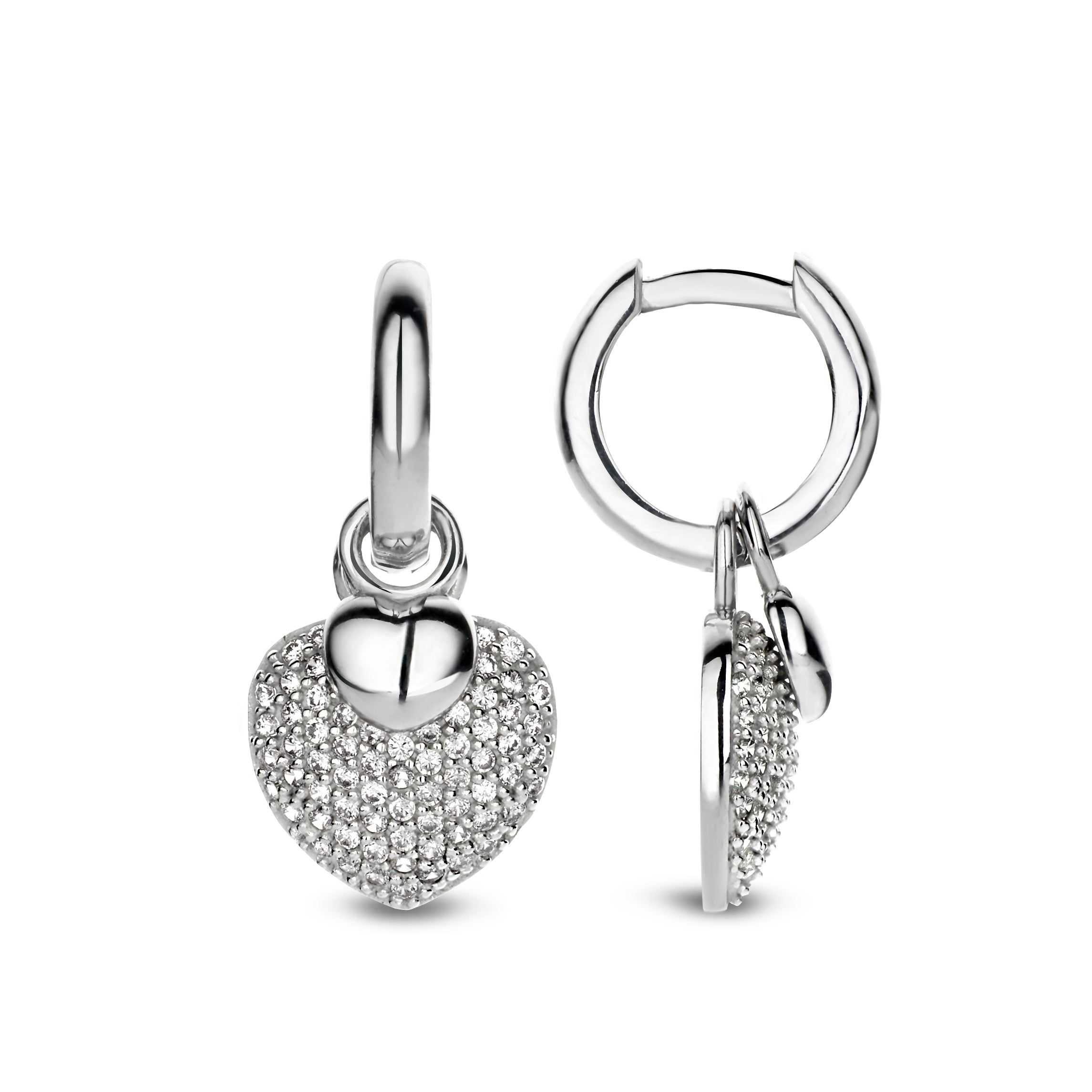 Cercei din argint 925 din colectia Trendy Chic by Siebel. Acesti cercei au un pandantiv in forma de inima. Cerceii au un diametru de 12 mm. Pandantivul este format dintr-o inima mica de 5 mm si o inima mai mare de 12 mm, setata cu zirconiu cubic. Pentru a va completa setul, colectia Trendy Chic include un colier asortat.