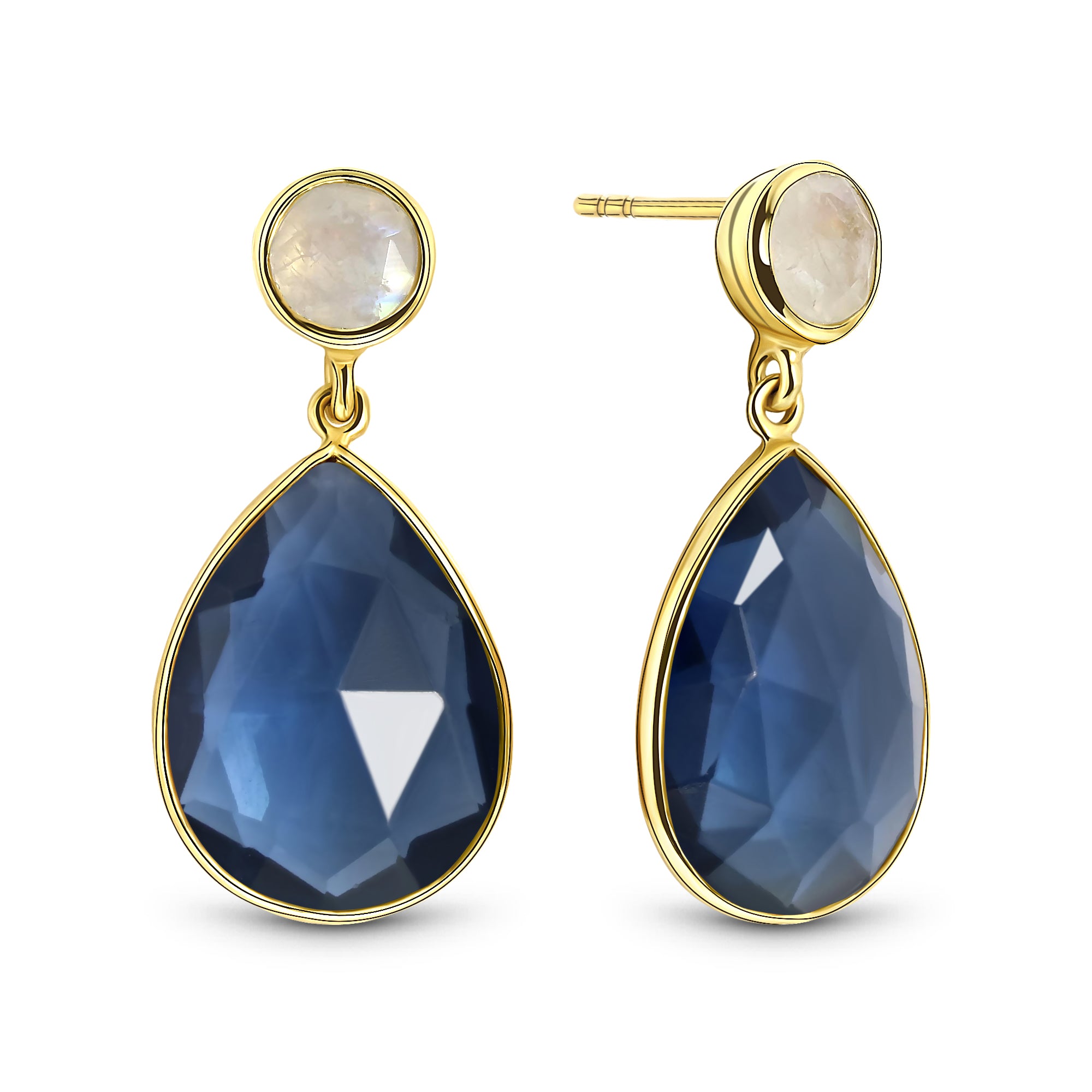 Cercei din argint 925 din colectia Salvatore Plata, cu un cuart iris si o piatra hidrotermala albastru inchis in forma de lacrima. Realizati din argint sterling si apoi placati cu aur, cerceii au 3 cm lungime si 1,5 cm latime.