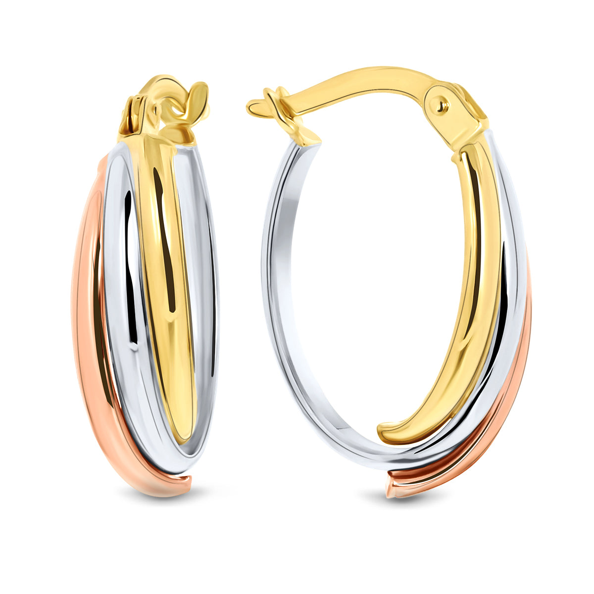 Cercei trio-color de 14 karate din colectia Twinline by Siebel. Acesti cercei multicolori atrag o adevarata ochi. Se inchid cu usurinta cu o inchizatoare. Cerceii au 20 mm lungime, 6,2 mm latime si 1,3 mm grosime.