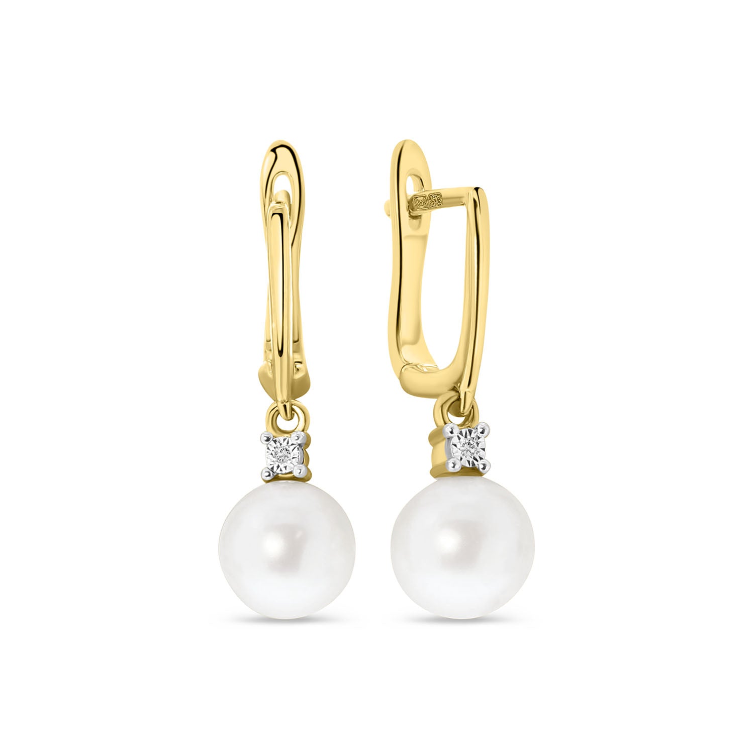 Cercei din aur galben cu perle si diamante din colectia Diamonds by Siebel. Confectionati din aur galben de 14 karate, acesti cercei prezinta o perla si un diamant intr-o montura de aur alb. Asociati acesti cercei cu bijuterii asortate din colectie pentru a va completa look-ul.