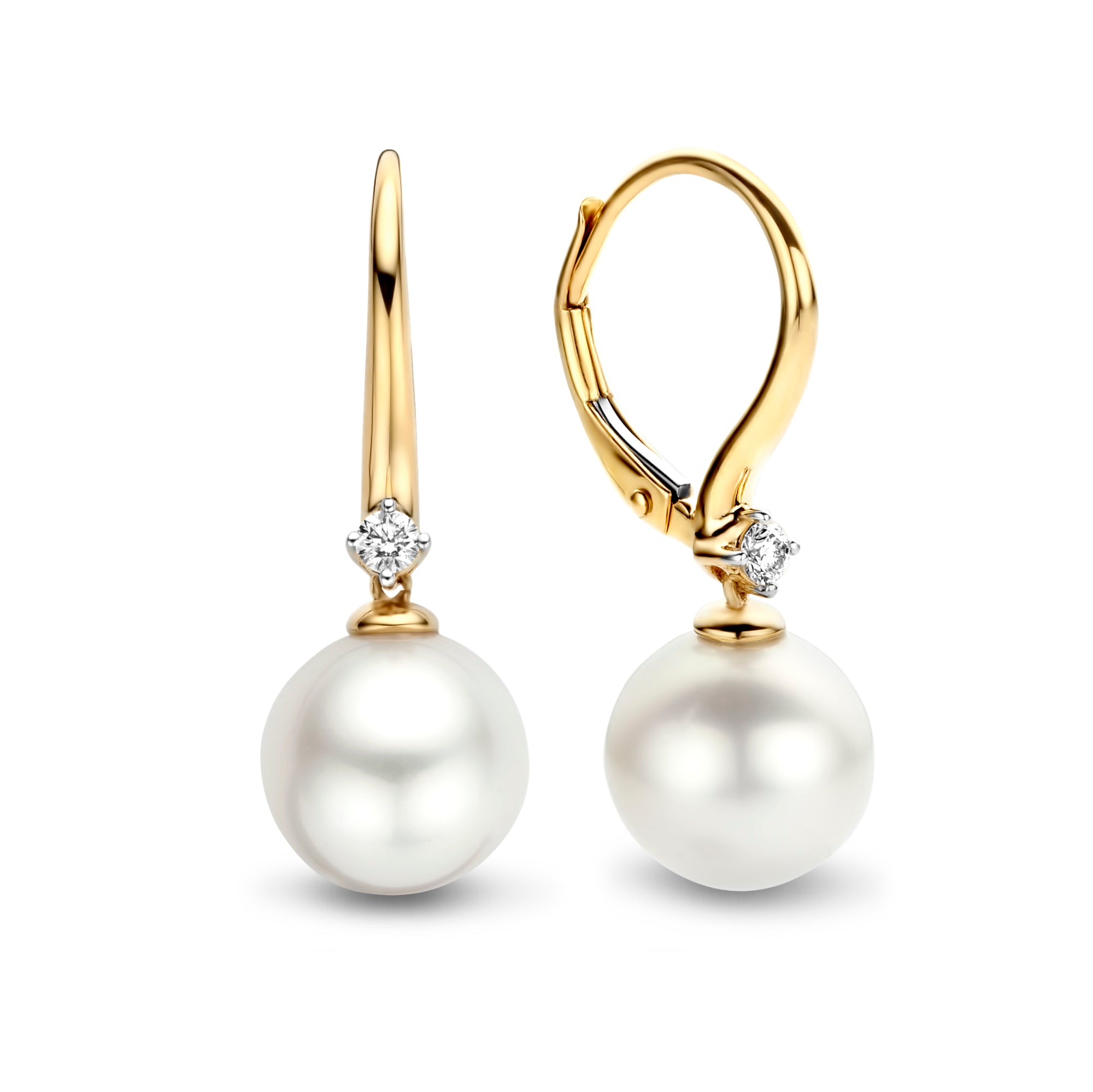 Cercei din aur galben cu perle si diamante din colectia Diamonds by Siebel. Confectionati din aur galben de 14 karate, acesti cercei sunt impodobiti cu diamante stralucitoare si au o frumoasa perla alba de apa dulce. Asociati acesti cercei cu alte piese din colectie pentru a va completa look-ul.