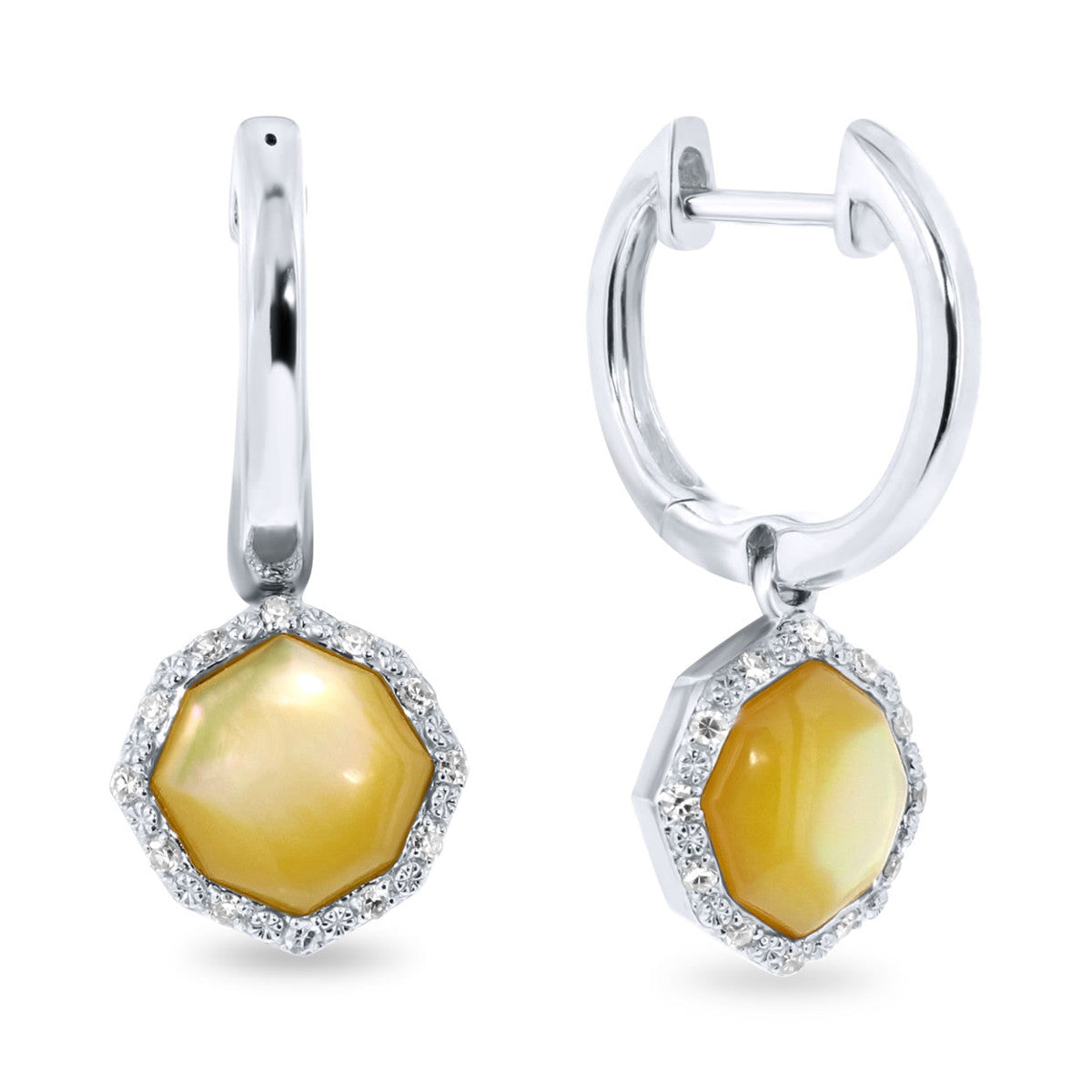 Cercei din aur alb din colectia Aurora de la Diamonds by Siebel. Cerceii sunt incrustati cu diamante si sidef.
