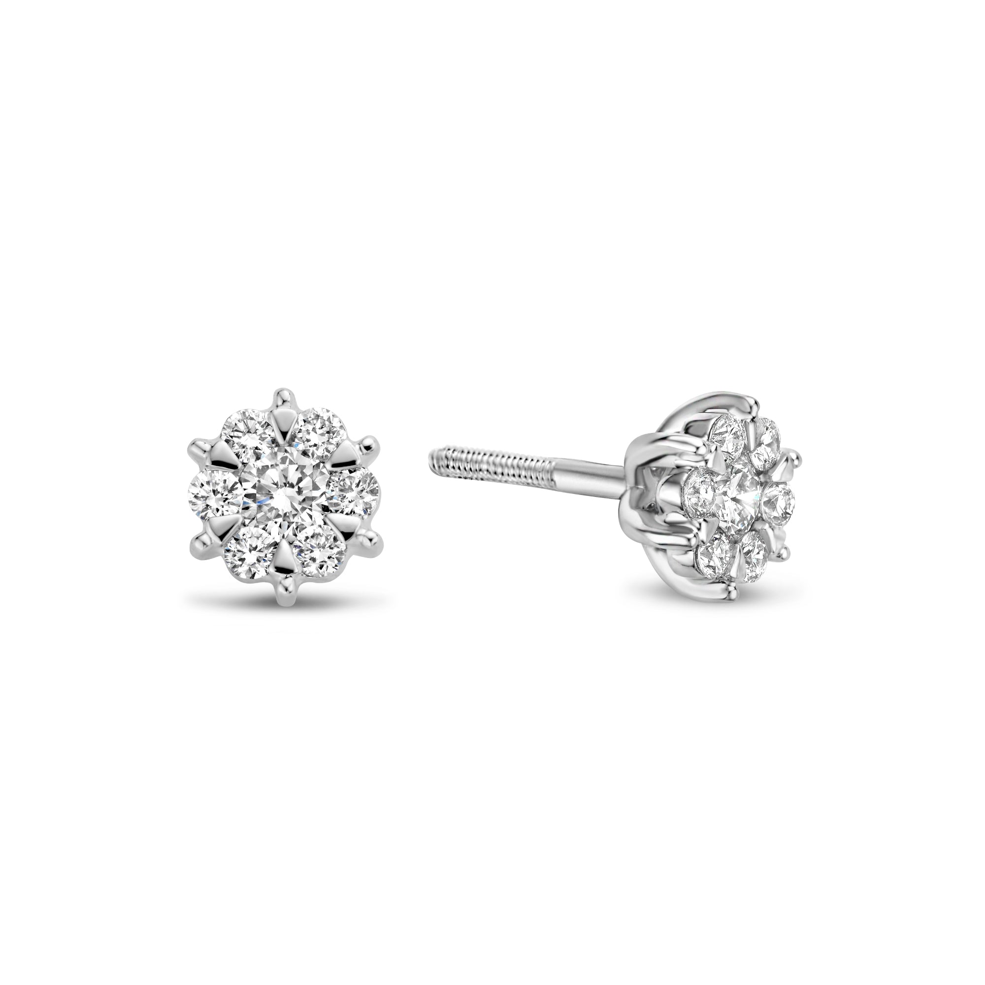 Acesti cercei cu stifturi din aur alb de 14 karate sunt din colectia noastra Millennium. Sunt sertate cu sapte diamante cultivate in laborator. Dimensiunile pietrelor variaza de la 0,14 la 0,17 ct si au un finisaj lustruit.