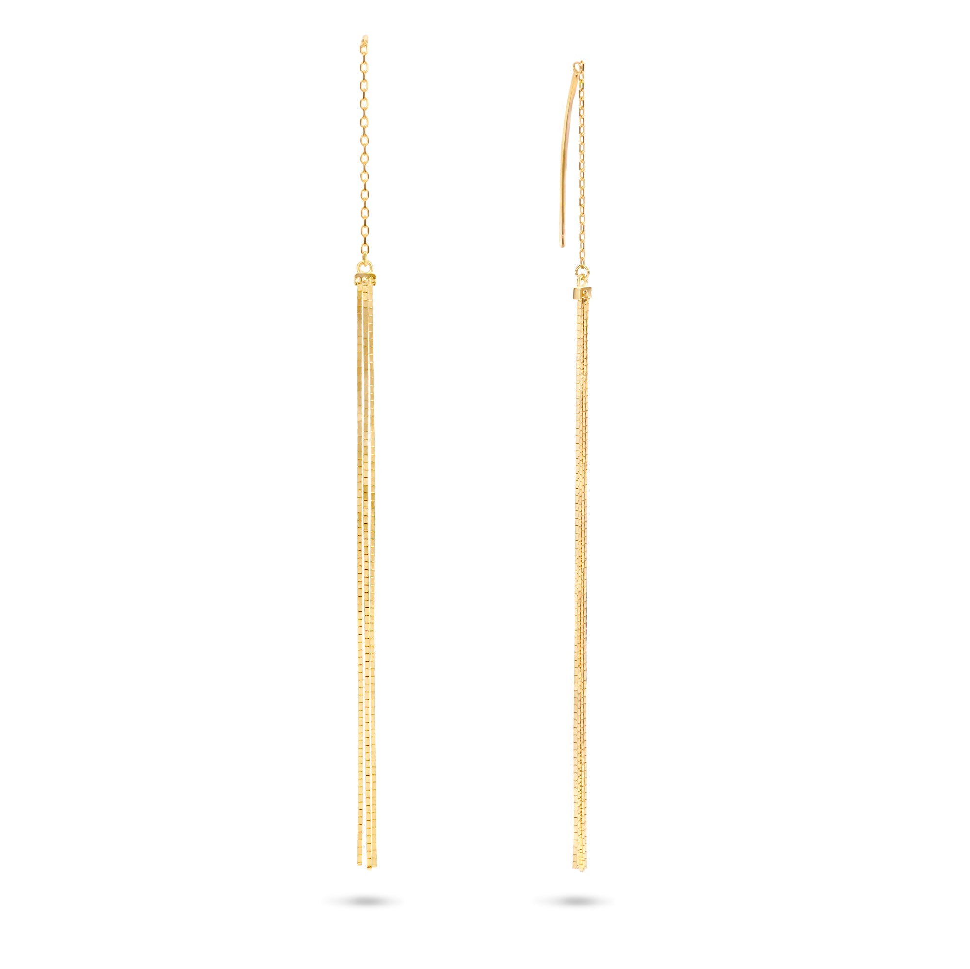 Cercei din aur galben de 14 karate din colectia Gold by Siebel. Cerceii au ciucuri cu lanturi atasate. Lanturile au o veriga venetiana. Cerceii au o lungime de 8,5 cm.