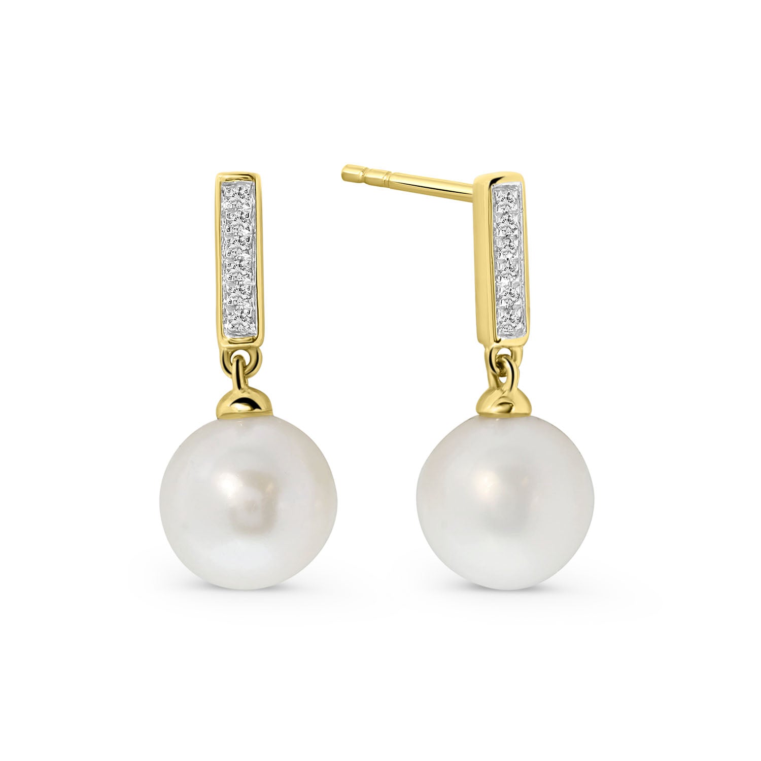 Cercei din aur galben cu perle si diamante din colectia Diamonds by Siebel. Realizati din aur galben de 14 karate, acesti cercei sunt impodobiti cu diamante frumoase taiate stralucitor. Pandantivul are o perla rotunda alba de apa dulce. Asociati acesti cercei cu alte bijuterii din colectie.
