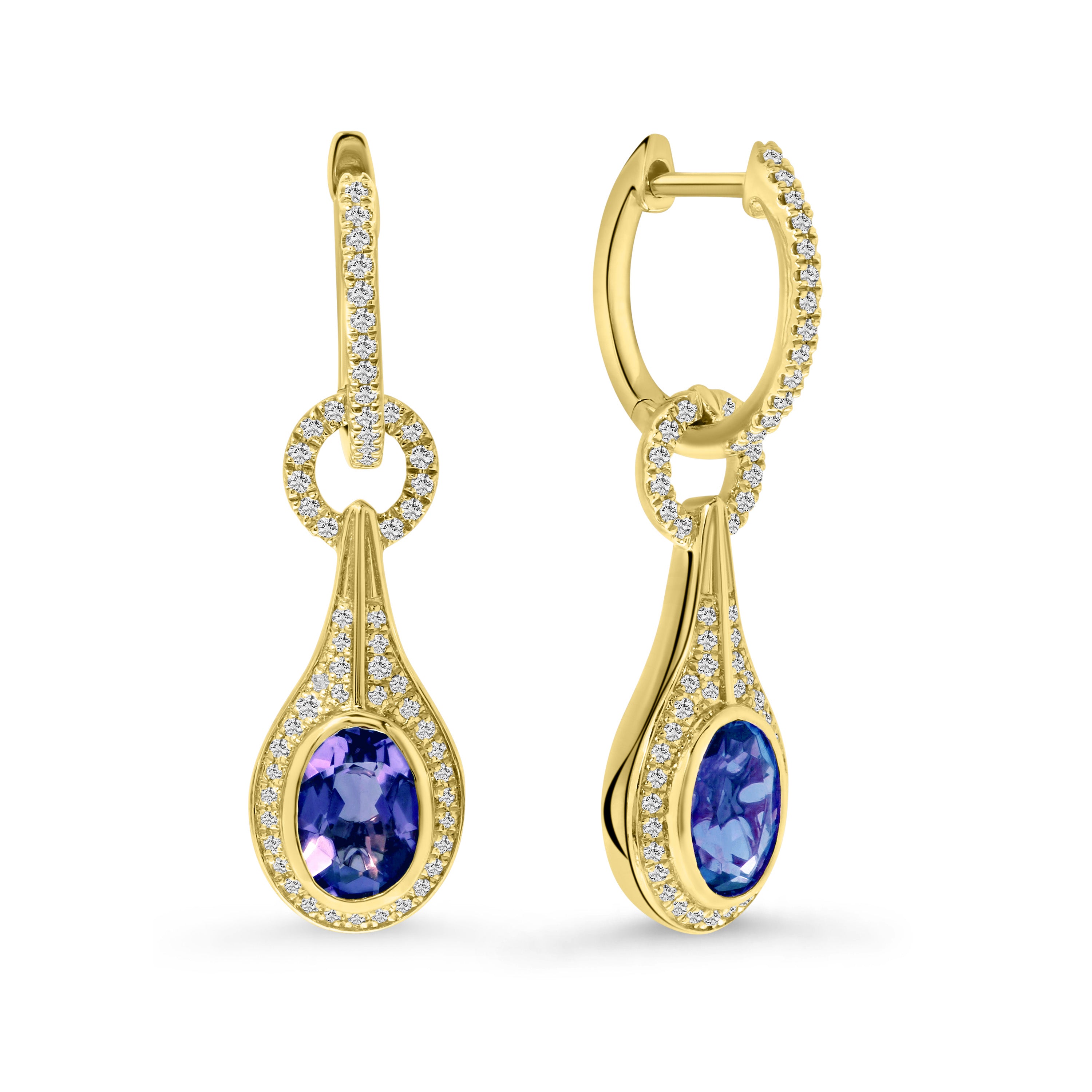 Cercei cu tanzanit din aur galben si cu diamante din colectia Diamonds by Siebel. Realizati din aur galben de 14 karate, acesti cercei prezinta tanzanit frumos taiat oval si diamante uimitoare taiate stralucitor. Se asorteaza perfect cu bratul si colierul asortate.