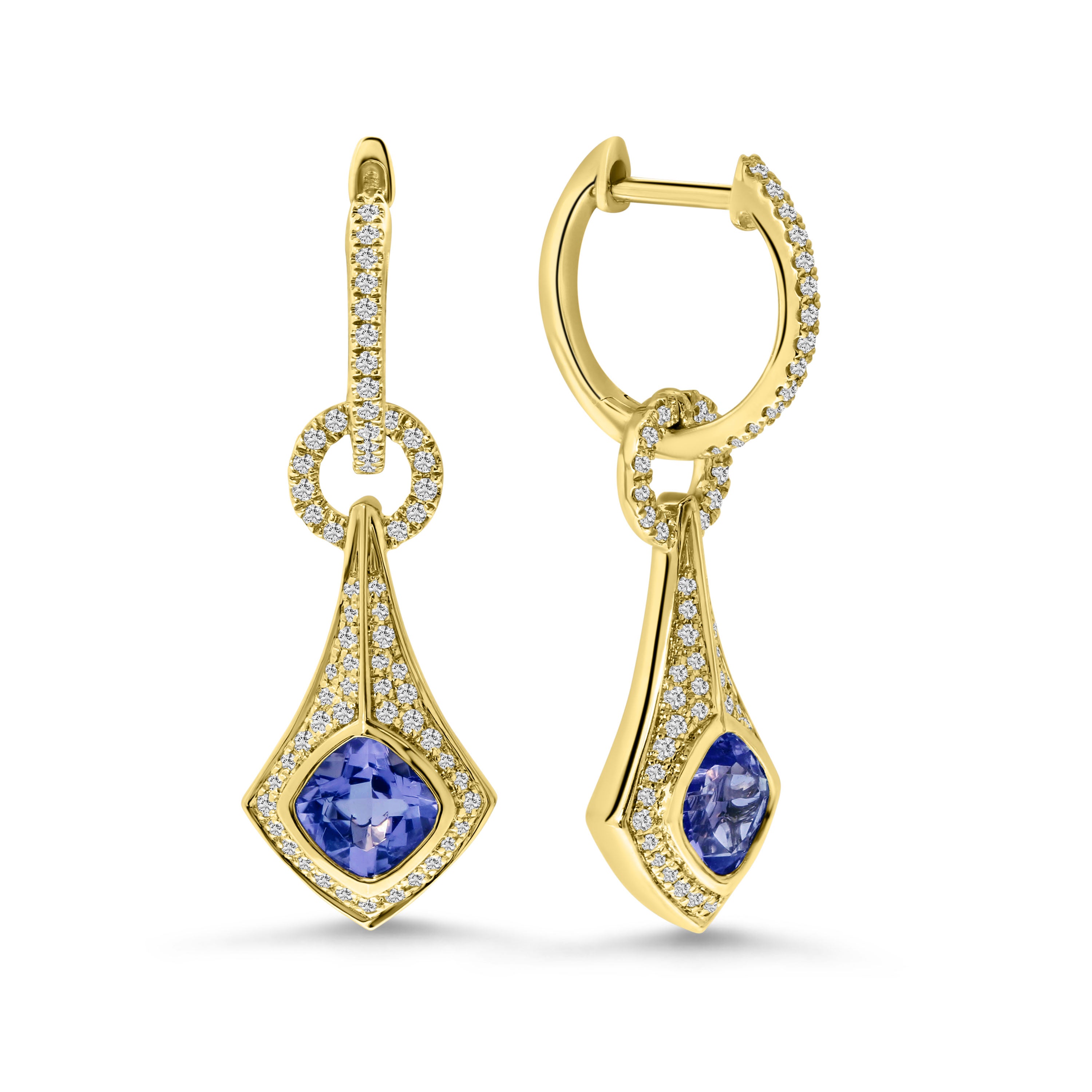 Cercei cu tanzanit din aur galben si cu diamante din colectia Diamonds by Siebel. Confectionati din aur galben de 14 karate, acesti cercei prezinta tanzanit frumos taiat perna si diamante uimitoare taiate stralucitor. Se asorteaza perfect cu bratul si colierul asortate.