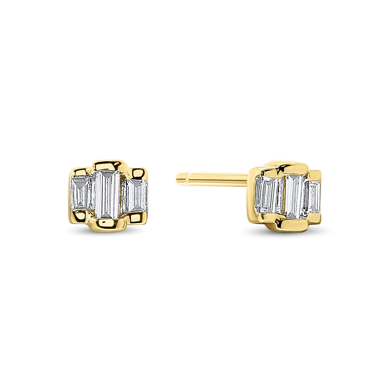 Cercei tip stift din aur galben de 14 karate din colectia Ice. Acesti cercei sunt impodobiti cu diamante frumoase taiate bagheta.