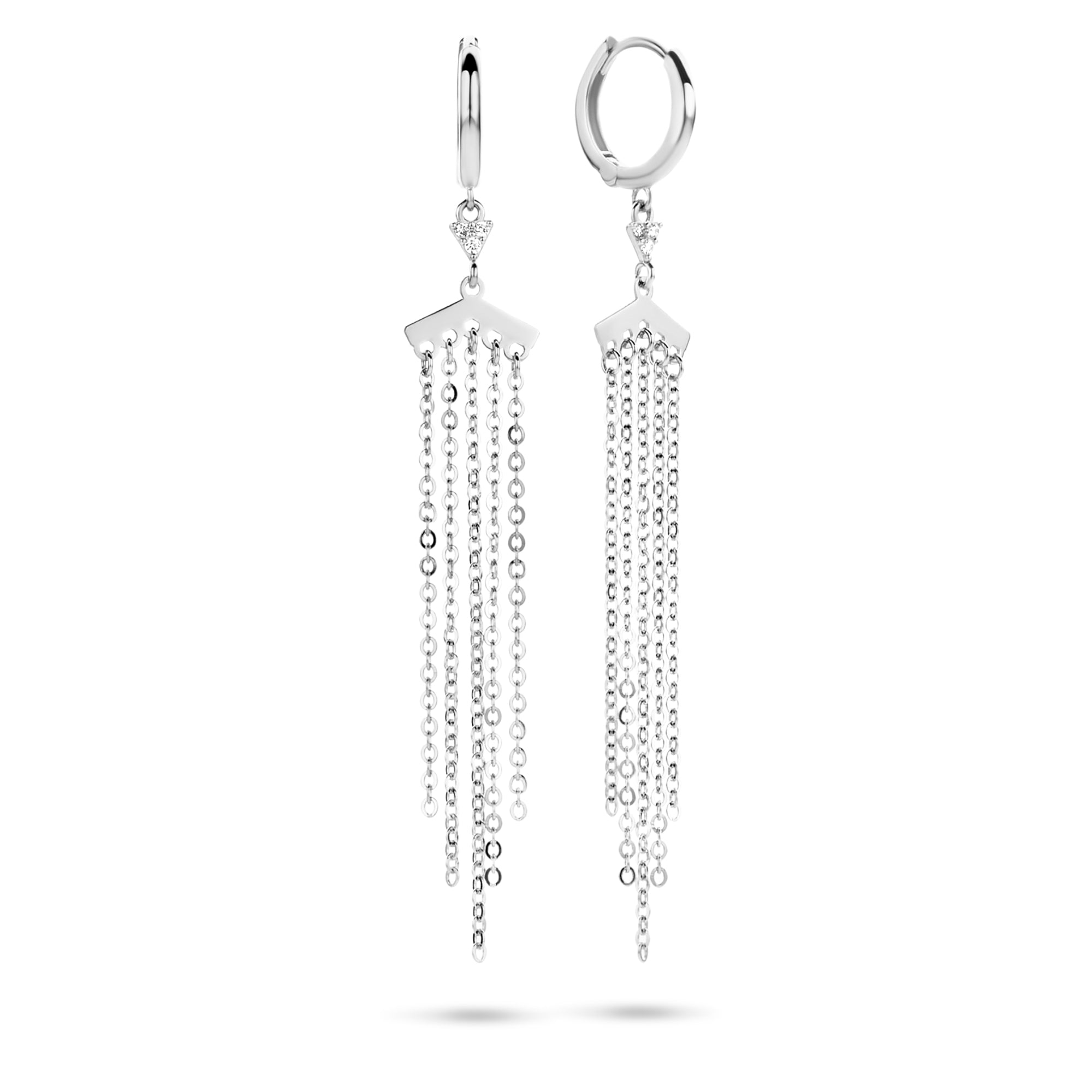 Cercei din aur alb de 14 karate din colectia Gold by Siebel. Cerceii constau din cercuri cu lanturi, placi si pietre de zirconiu atasate. Diametrul cerceilor este de 7 mm. Lungimea totala a cerceilor este de 6 cm.