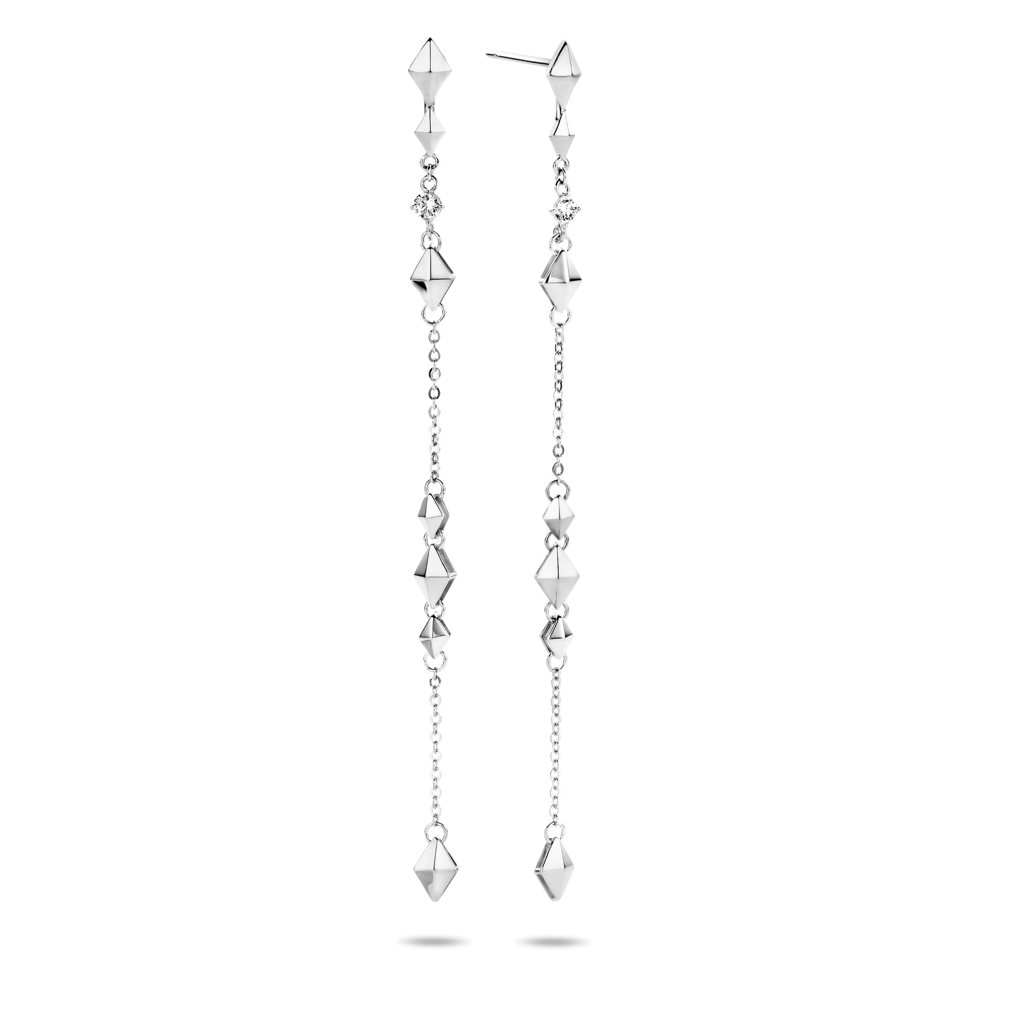 Cercei din aur alb de 14 karate din colectia Gold by Siebel. Fiecare are 7 diamante si 1 zirconiu. Cerceii au o lungime totala de 8 cm. Au 4,10 mm latime si 1,29 mm grosime.