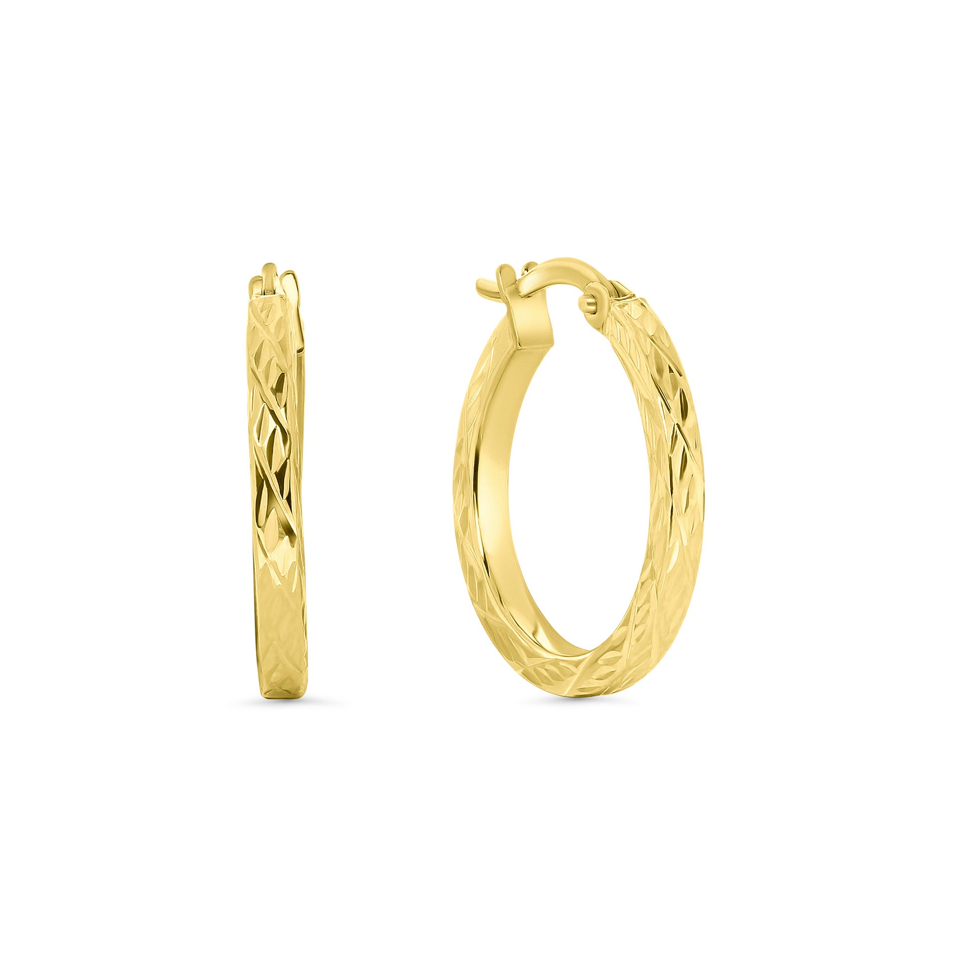 Cercei din aur galben din colectia Gold by Siebel. Acesti cercei sunt confectionati din aur galben de 14 karate si au un design taiat cu diamant. Combina-le cu alte bijuterii din colectie.