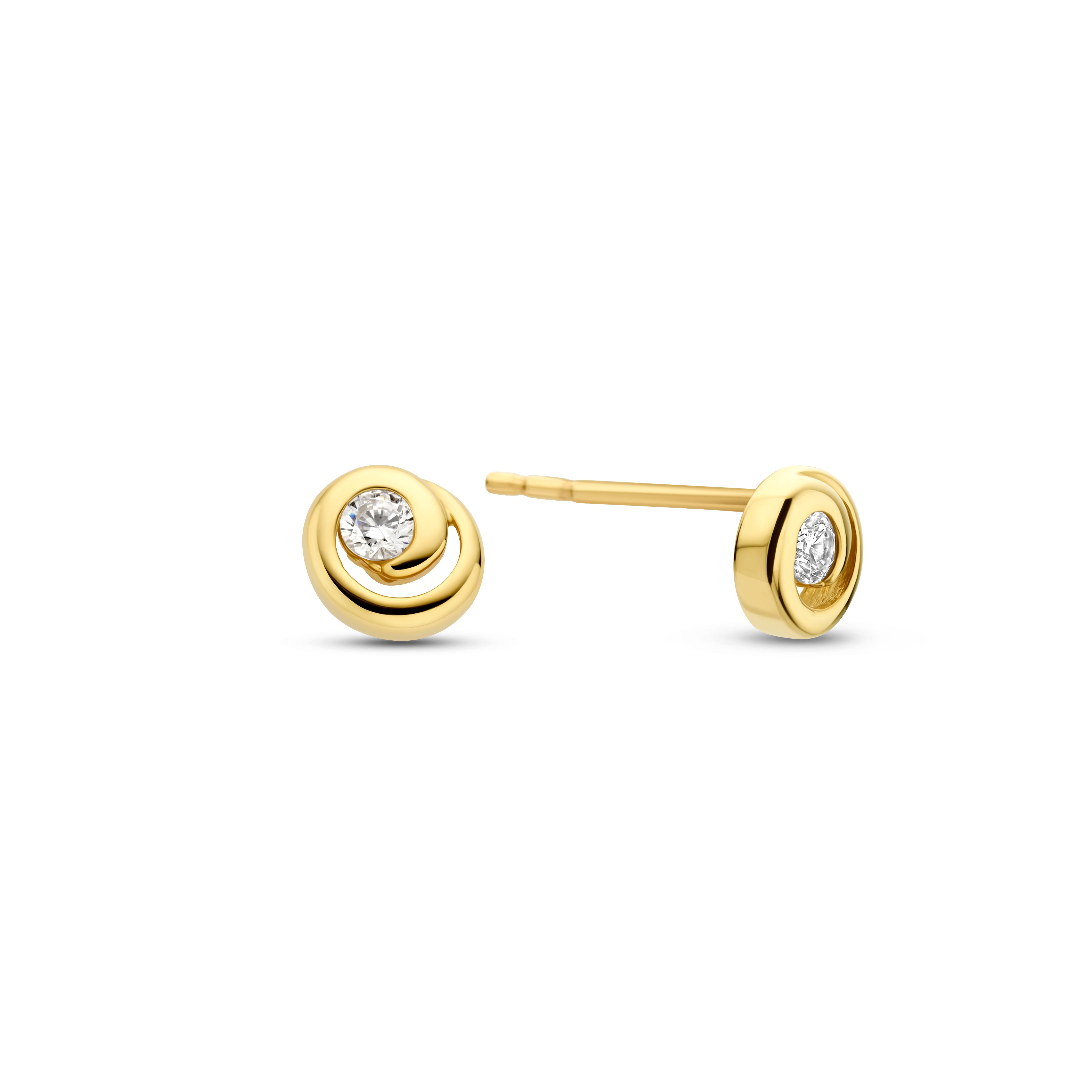 Cercei tip stift din aur galben de 14 karate din colectia Gold by Siebel. Acesti cercei au forma unei bucle rotunde si ambii sunt impodobiti cu zirconiu.