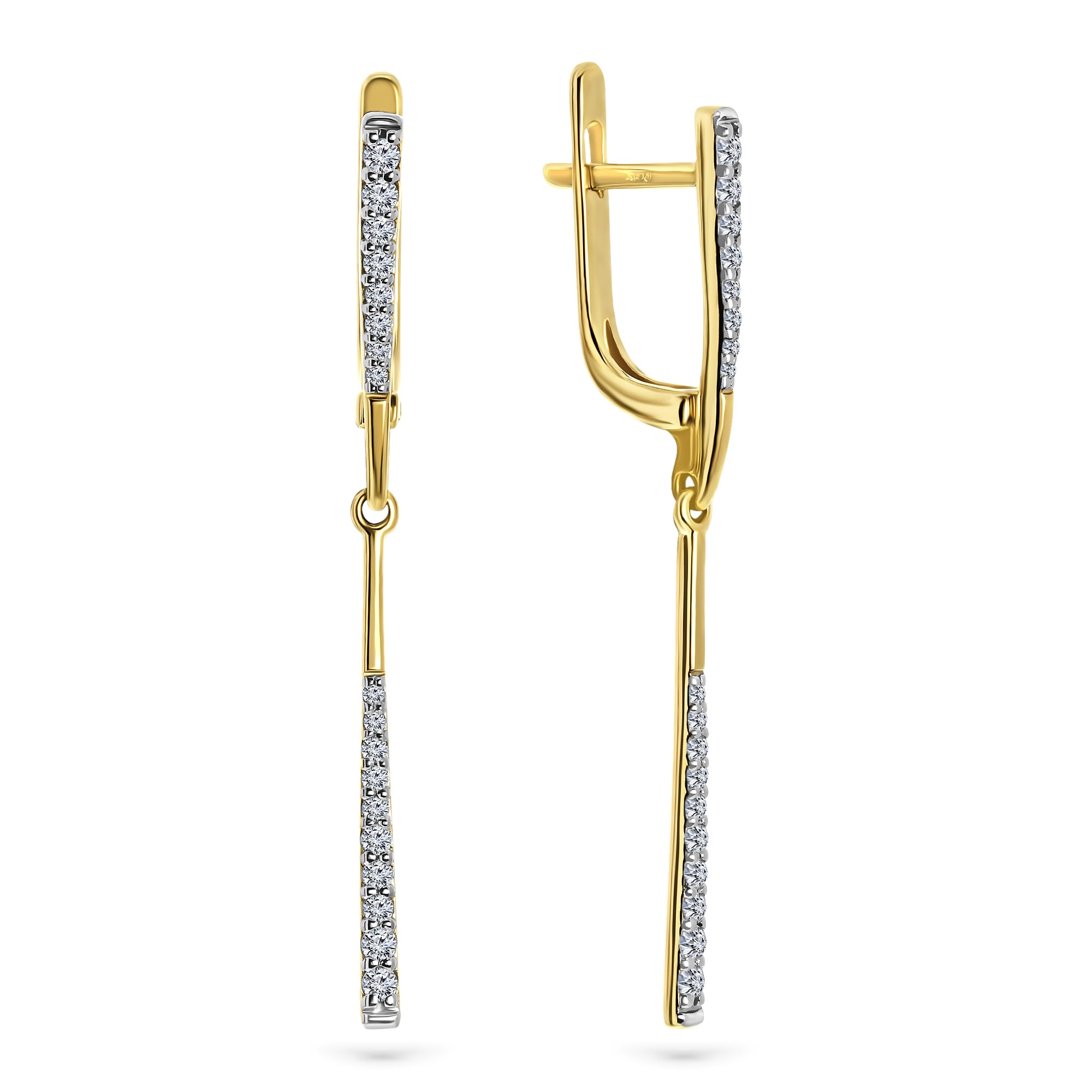 Cercei din aur galben de 14 karate din colectia Gold by Siebel. Pandantivul se leagana gratios. Zirconia cubica creeaza o stralucire frumoasa pe masura ce se misca. Zirconia cubica din stift este setat in dimensiuni descrescatoare, in timp ce pandantivul este setat in dimensiuni crescatoare. Fiecare cercel este fixat cu 18 zirconii cubici. Cerceii au o lungime totala de 3,8 cm, o latime de 1,7 mm si o grosime de 10,3 mm.
