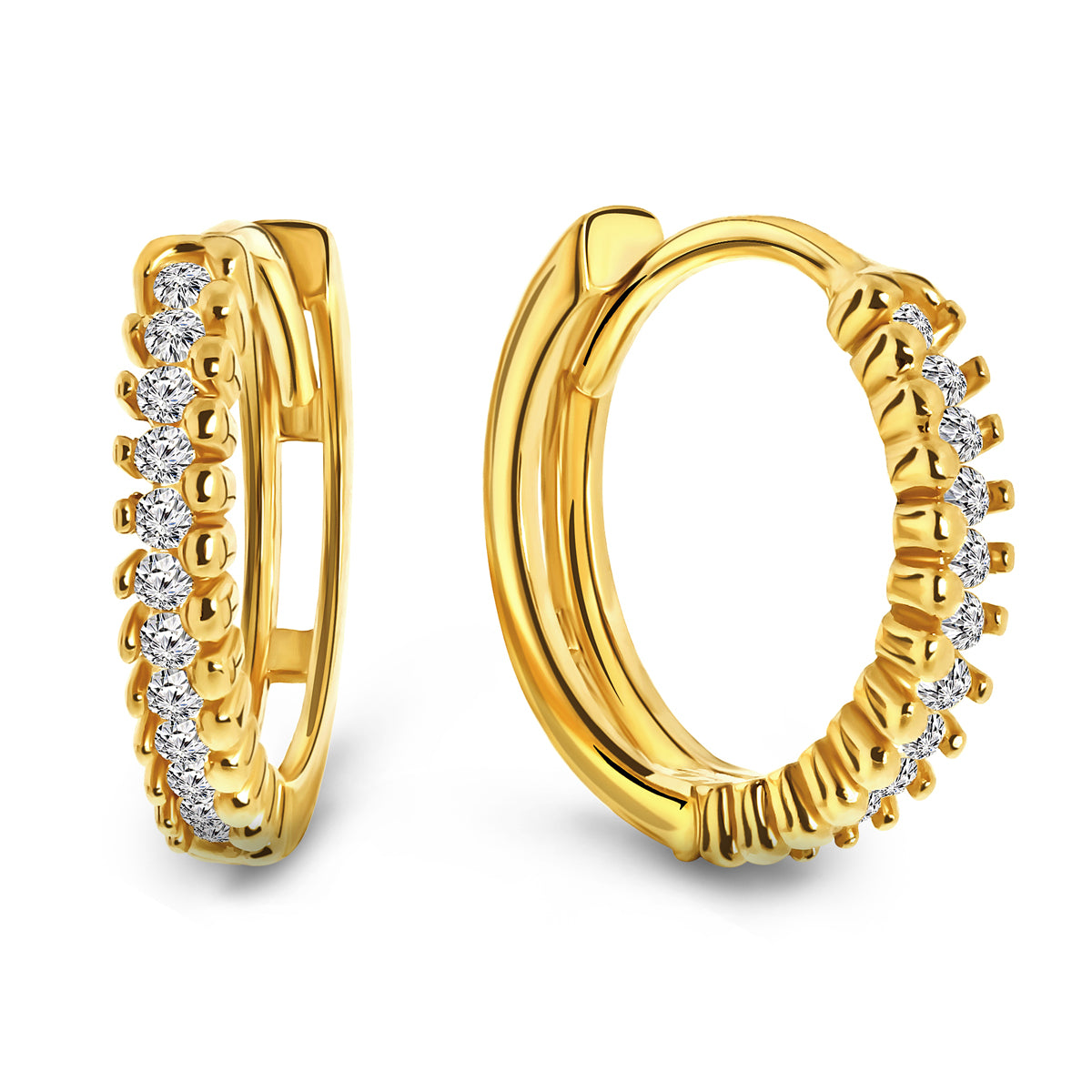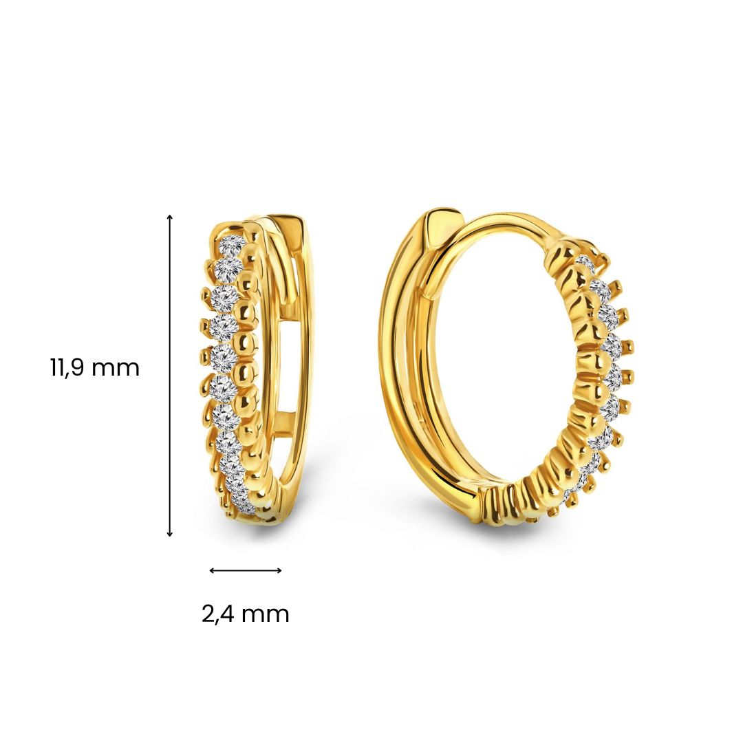 Cercei din aur galben de 14 karate de la Gold by Siebel. Cerceii prezinta un rand de zirconiu in fata. Fiecare cercel are 12,4 mm in diametru si 2,4 mm grosime.