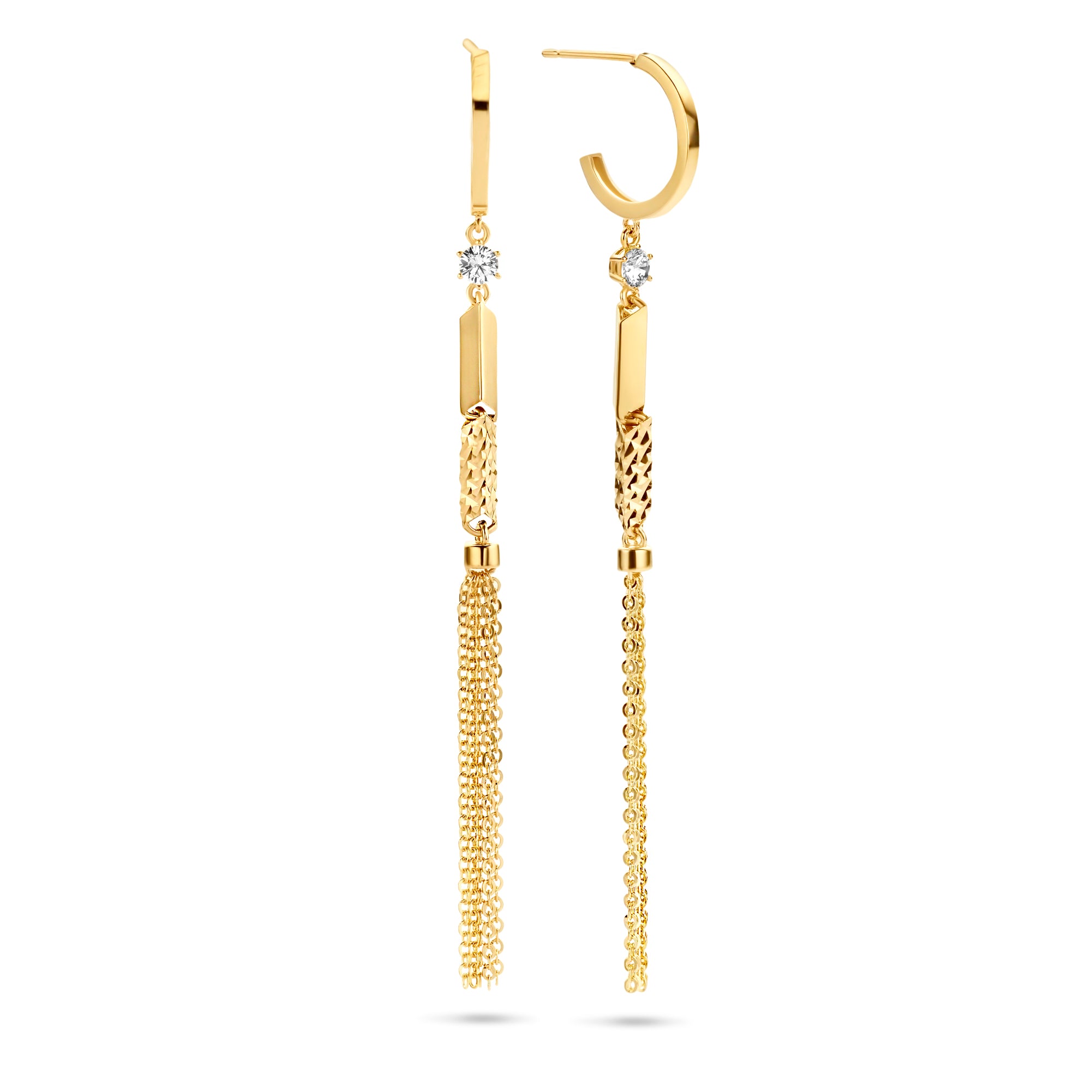 Cercei din aur galben de 14 karate din colectia Gold by Siebel. Fiecare cercel este format din cercei cu cerc, fiecare cu un singur zirconiu atasat. Cerceii sunt realizati din bare si lanturi. Au 7 cm lungime, 1,59 mm latime si 1,47 mm grosime.